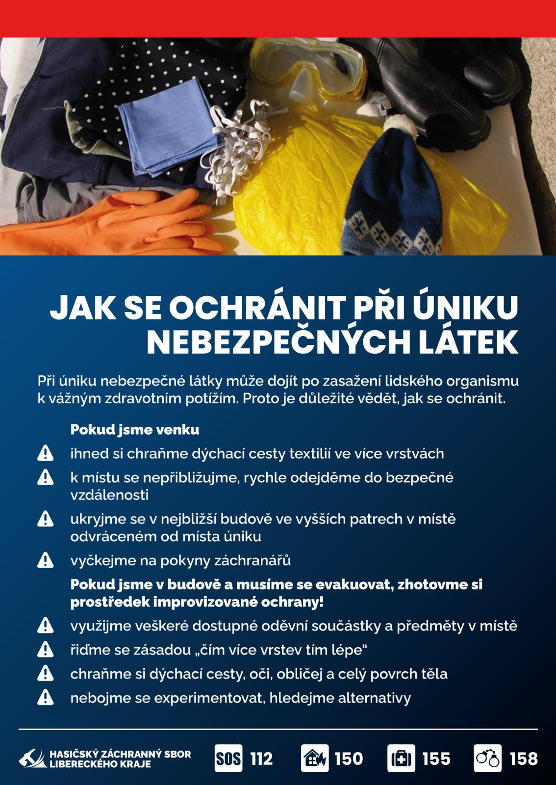 Nastat může ale také situace, kdy z výše uvedeného výčtu vhodných materiálů nebudeme mít některý nebo žádný při ruce. Nebojme se experimentovat, hledejme alternativy! Použijme igelitové sáčky, pytle, přikrývky, plachty, zkrátka cokoliv, co zabrání účinku nebezpečné látky na náš organismus. Tyto jednoduché kroky mohou být klíčové při ochraně před únikem chemických látek a mohou nám zachránit život.
