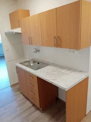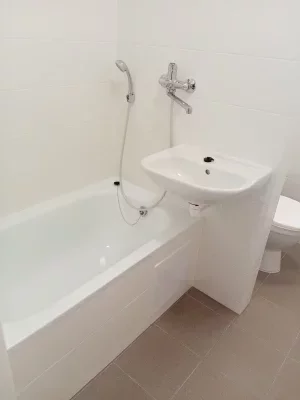 Jednopokojový byt s kuchyňským koutem o užitné ploše 34 m2. Součástí bytu je velký pokoj s lodžií, chodba s kuchyňským koutem, koupelna s vanou, WC. K bytu také náleží sklepní kóje v přízemí bytového domu.