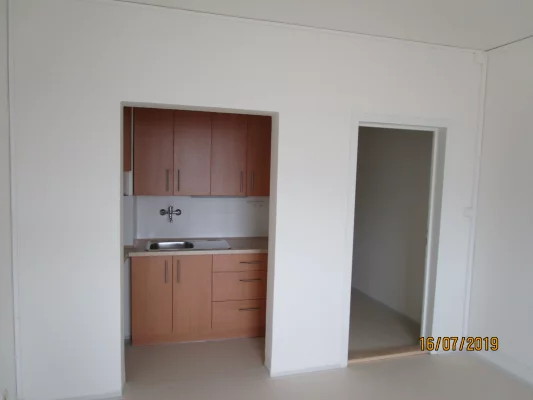 Byt má užitnou plochu 54 m2 - předsíň, koupelnu, místnost s kuchyňským koutem, menší místnost a balkon. K bytu dále náleží sklepní kóje v 1. podzemním suterénu.