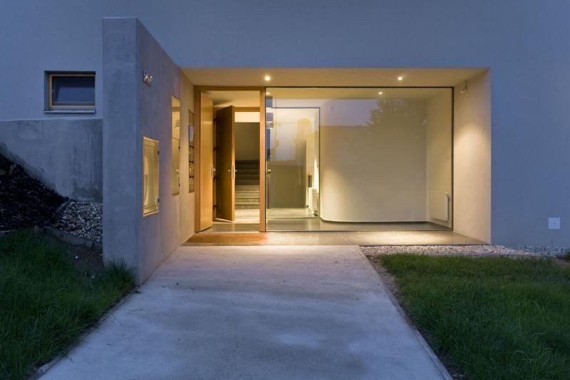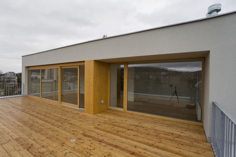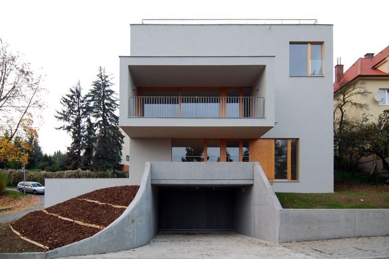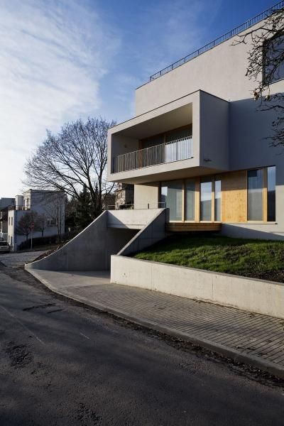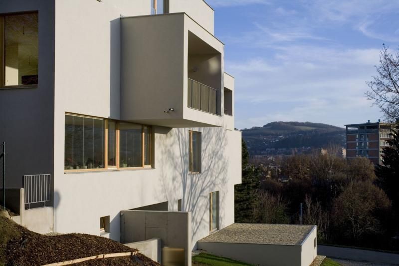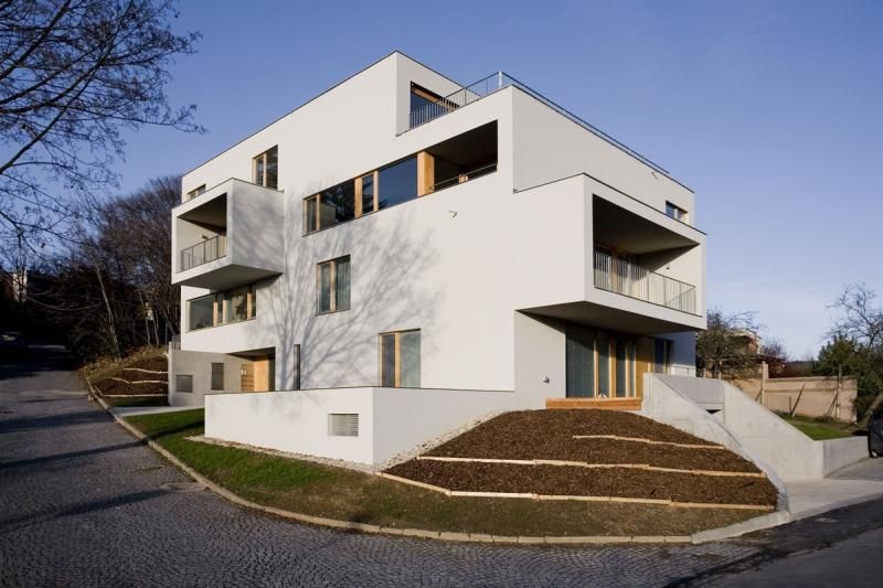 Čtyřpodlažní budova s nadstandardním bydlením (celkem 6 bytů) je tvořena jedinou hmotou, která vyrůstá z podnože, kde je umístěno parkování. Platforma je díky svažitosti pozemku zahloubena do stávajícího terénu a je ve stejné úrovni jako přiléhající Partyzánská ulice. Důležitou roli při prostorovém formování sehrálo měřítko okolní zástavby. Hmotová kompozice objemu je výrazně ovlivněna i nárožní polohou.