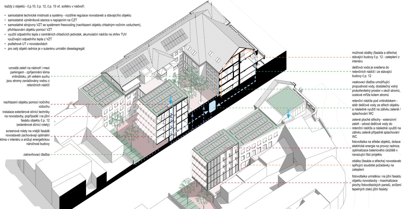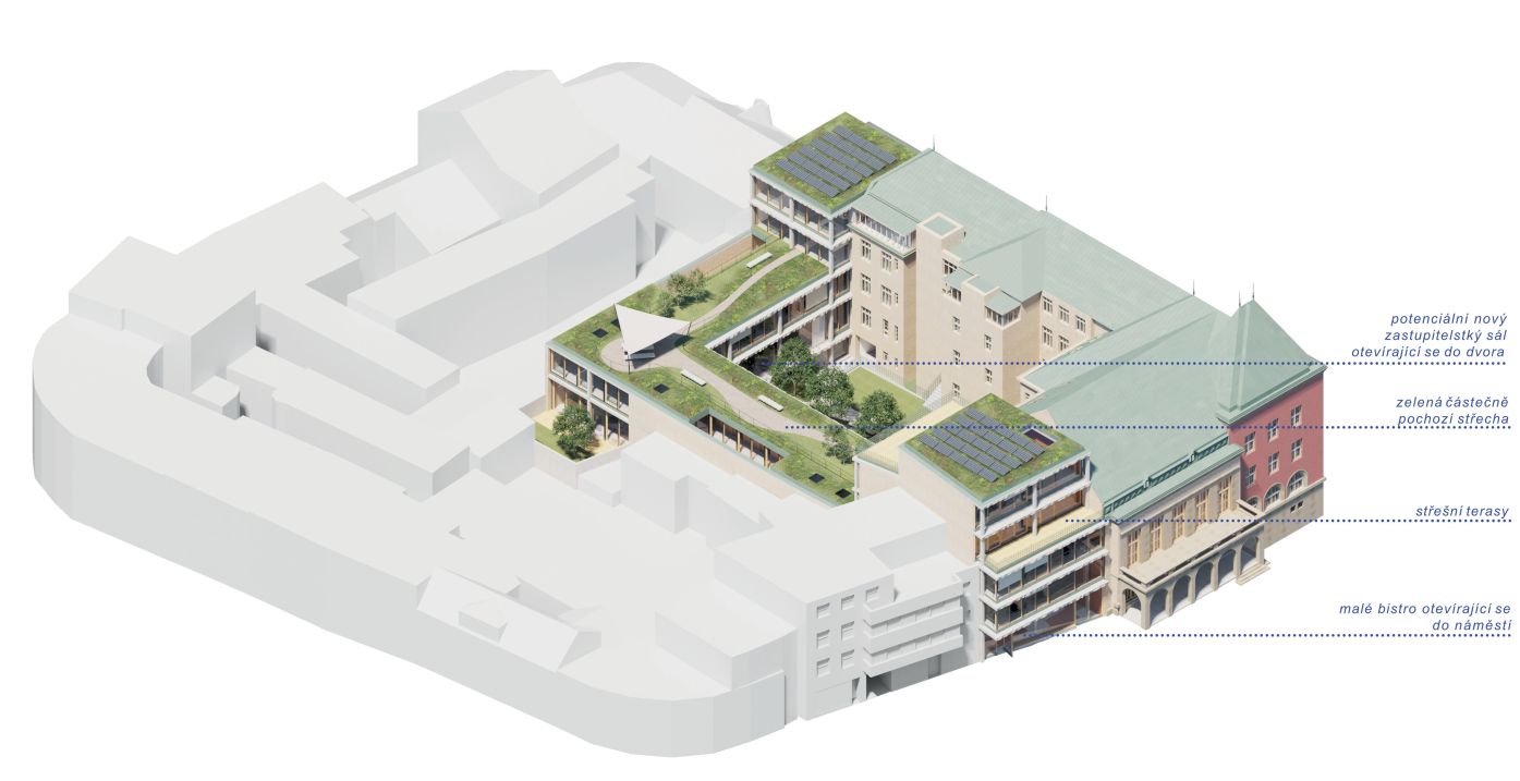 Účel soutěže: Účelem soutěže je v ideové rovině řešení celého stavebně-provozního souboru radnice skládajícího se z několika sousedících budov, včetně uvažované dostavby ve vnitrobloku, s ohledem na absorpční možnosti areálu, urbanistické souvislosti a majetkoprávní vztahy. V projektové rovině je důraz kladen na první realizační etapu, přibližně vymezenou stávajícím objektem č.p. 10, který je v havarijním stavu. Důležitá bude možnost etapizace a zachování provozu hlavní budovy č.p. 12 během realizace všech etap výstavby. Očekává se citlivý přístup k hodnotným památkově chráněným budovám i ke svému okolí.