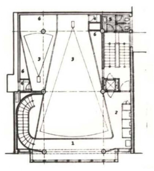 V původní podobě domu byla v přízemí hala, recepce, služby fotoamatérům a malé studio, z haly vedlo elegantní monolitické točité schodiště do hlavního studia pro velké záběry v 1. patře. Protilehlá stěna u hlavního průčelí měla být upravena jako matrice, na niž ze zadní strany (studio) bude možno promítat zdařilou denní práci. Další podlaží sloužila kancelářím a laboratořím, ustupující 6. podlaží pak jídelně s přístupem na terasu. Hygienické zázemí je situováno na mezipodestách.