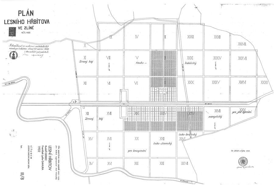 Původní hřbitov se rozprostíral jihovýchodně od hlavního zlínského náměstí a měl rozlohu 5.143 m2 koncem 30.let 20.stol. začala být jeho kapacita nedostačující. Pro nový hřbitov byl zvolen prostor smíšeného březnického lesa. Zbudována byla pouze hlavní hřbitovní komunikace. Skupiny hrobů byly přístupny jen lesními cestičkami. Autor usiloval o zachování kvalitního přírodního prostředí . Této myšlence byl podřízen i charakter všech výtvarných prvků, především pomníků - neměli být okázalé ,mohutné ani z nápadných materiálů. Starosta Tomáš Baťa podal městskému zastupitelstvu 20. 6. 1930 návrh na zřízení Lesního hřbitova na ploše 20 ha. Výměrem okresního úřadu v UH roku 1931 bylo povoleno zřídit Lesní hřbitov. Součástí bylo schválení hřbitovního řádu a poplatků. Projektován byl panem Gahurou, inspiraci si přinesl Tomáš Baťa z Ameriky a lesního hřbitova Bor u Č. Lípy kolem roku 1909. Hlavní myšlenka byla zřídit hřbitov, který by byl vzdálen od průmyslového ruchu a rychle se rozrůstajícího města. Bylo tím vyřešeno pohřbívání na 100 let - plánovalo se s 30 000 hrobovými místy při době tlení 15 let. Prvním pochovaným byl syn MuDr. Gerbece, dalším pak byl zakladatel továrny a města Tomáš Baťa (14. 7. 1932)a jeho pilot Jindřich Brouček. Tyto hroby se stávají základem skupiny čestných hrobů baťovy rodiny a blízkých spolupracovníků. Hřbitov byl vysvěcen v roce 1932 ThDr. Hejšlem a v roce 1934 byla vybudována nová cesta na Lesní hřbitov.
