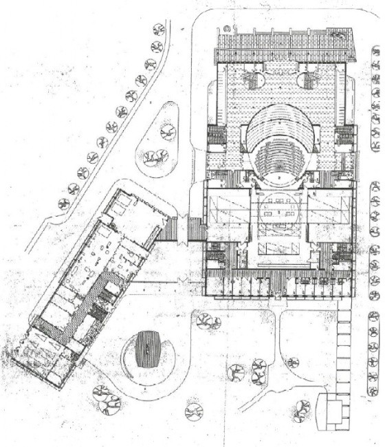 V roce 1957 byla vypsána anonymní soutěž a v roce 1958 byl vybrán návrh architektů Miroslava a Karla Řepových na projekt činoherního divadla. Po dlouhých letech usilování, plánování, potíží a obav, zda se podaří dílo uskutečnit, dostalo město 11. 11. 1967 divadelní budovu. Jedná se o soubor dvou volně stojících objektů (hlavní a provozní)spojených dvěma komunikačními krčky, umístěných v centru města na přibližně trojúhelníkovém pozemku, doplněných uličním parterem se sochařskými díly a zadním parkem s kašnou. Hlavní budova je příkladem reprezentativní, bohatě materiálově i umělecky vybavené architektury s některými rysy Bruselského stylu. Sálu dominuje lomenicový dřevěný podhled. Střízlivá noblesa interiérů, kontrastuje s monumentálním vnějším výrazem hlavní budovy, obložené několika druhy kamene. Hlavní průčelí je v patře celé proskleno, tím vytváří světelně proměnlivé pozadí soše vznášející se můzy. Dynamicky působí provozní budova s křivkou spojovacího krčku a zvlněnou siluetou. I přes své nesporné kvality znamenala stavba divadla tvrdý zásah do městské struktury, mimo jiné spojený s demolicí fary.