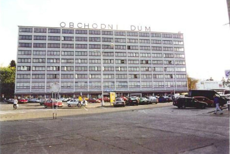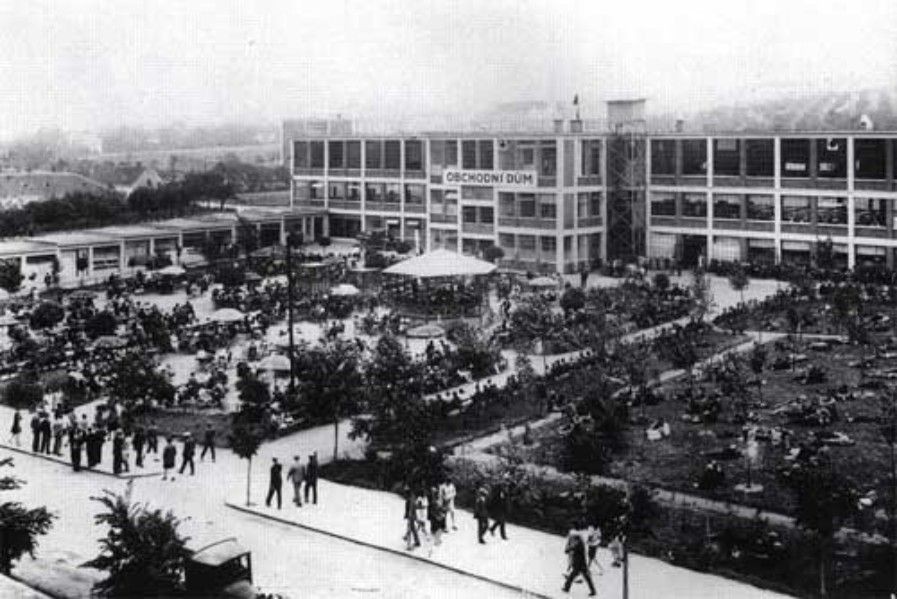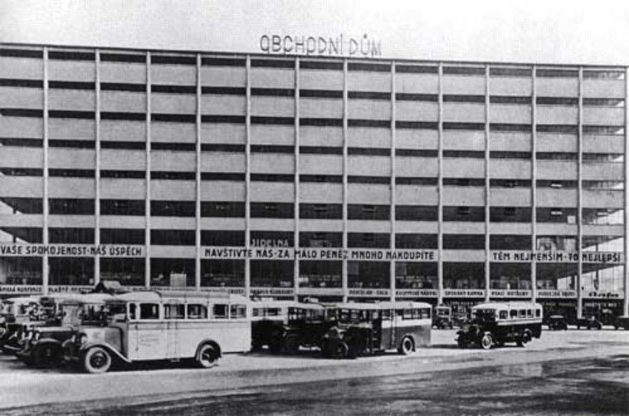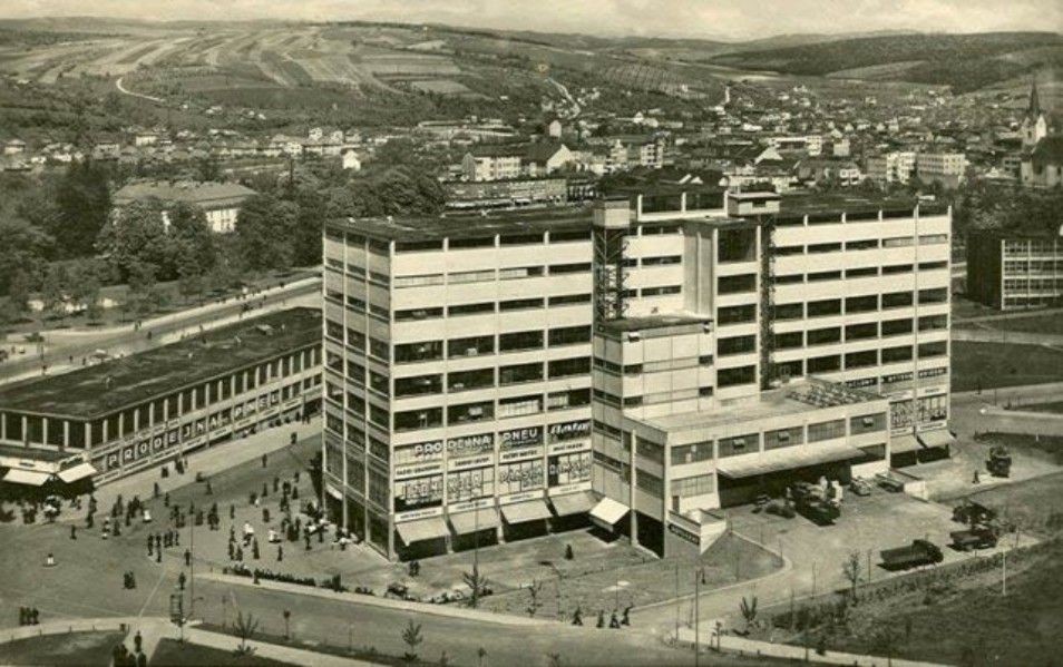 Obchodní dům služeb ve Zlíně byl jednou z prvních staveb na nově se formujícím náměstí Práce, při jeho umístění architekt respektoval nejen dráhu železniční vlečky směřující z továrny do cihelny, ale také konfiguraci terénu. Dispozice Obchodního domu ovlivnila i projekt skupiny internátů nad ním. Zadní technické zázemí doplnil v r. 1934 Vladimír Karfík. Zajímavá byla gradace zmenšující se výškou pásových oken směrem nahoru. Tento architektonicky mimořádně účinný prvek opticky odhmotňující stavbu se s časem měnil v návaznosti na způsob využívání horních podlaží byly postupně jejich parapety snižovány. Důležitým výtvarným prvkem dotvářejícím fasádu byly i četné reklamní nápisy. Celková architektonická koncepce budovy byla znehodnocena úpravami ze 70. let, kdy obklady z hliníkového plechu a nová okna zcela degradovaly výraz stavby (zrušení gradace, změna materiálu). Dnešní podoba dvorního traktu je z r. 1961.