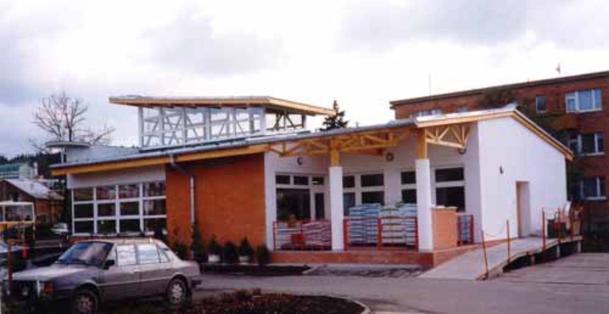V původní studii pavilonu Oškera na Zálešné z roku 1995 měl pavilon romantičtější výzor se zaobleným průčelím, jehož mohutné prosklení pokračovalo i ve střeše a bylo ukončeno skleněnou lucernou. Realizovaná stavba je mnohem technicistnější, nepostrádá však vtip, vzdušnost a eleganci. Přízemní stavba je postavena z tradičních materiálů, zastřešena dřevěnými příhradovými vazníky. Na fasádách se střídá bílá omítka, červené obklady cihelných pásků, bílé rámy oken a dveří a přírodní barva dřeva. Dominantou je velký střešní světlík s přetaženou pultovou střechou , v nejvyšším bodě dosahující téměř 7 metrů. Je oním nezbytným ozvláštněním, které dělá z jinak nenápadné stavby výraznou architekturu.
