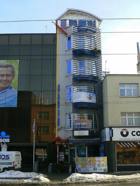 Zcela atypický objekt byl vklíněn mezi stávající zástavbu na ulici Dlouhá do proluky klínovitého tvaru, kde fasáda má šířku 5,4 m a dvorní trakt 2,6 m! Prostor ještě výrazně zmenšuje výtahová šachta ČSOB, která rozděluje parcelu na dvě části spojené průchodem širokým pouze 80 cm. Celý objekt je 22 m hluboký a 22 m vysoký. Urbanistické a architektonické řešení objektu ovlivnila nesourodá okolní zástavba, frekventovaná komunikace, oslunění atd. Původním záměrem bylo vytvořit lůžkovou kapacitu (16 lůžek a 3 přistýlky), dnes však slouží všechny místnosti jako kanceláře. Konstrukce je železobetonová monolitická s tloušťkou stěn 15 cm a stropů 18 cm. Jak v exteriéru tak i v interiéru je použito stejných materiálů - žula, nerez v kombinaci s bukovým mobiliářem, doplněným černými deskami LPD. Architektura pensionu je technicistní, dynamicky členitá s výraznou barevností. Uliční fasádě dominuje ocelová žaluzie z parabolických lamel, na nosných roštech osazena zelení. Tvar střechy je shodný s tvarem půdorysu objektu a vyjadřuje sevřenost hmoty objektu v proluce. Svou netypičností v rámci tradiční zlínské architektury vyvolává v divácích obě extrémní polohy pocitů: od nekritického obdivu až po absolutní negaci.
