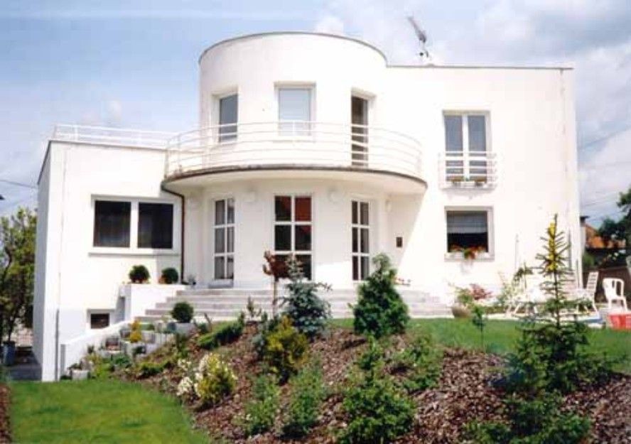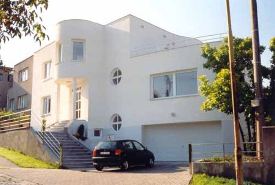 "Meierovsky" střižená bílá vila využívá klesajícího terénu pro částečný technický suterén s dvougaráží, přístupnou z úrovně ulice. Obytné patro je z ulice přístupné po schodišti. Hlavní obytná místnost je propojena do zahrady s bazénem. Vnitřním schodištěm je dostupné druhé patro s velkou terasou. Kubická hmota je oživena půlválci jak z uliční, tak i ze zahradní strany.