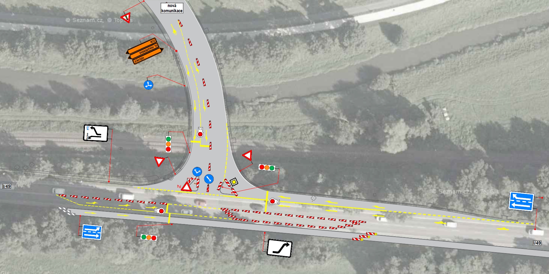 - Nové silniční napojení - odbočení ze silnice I/49 do Průmyslové zóny a stejně tak z Průmyslové zóny na I/49 bude bez omezení pro všechna vozidla do všech směrů. Tato křižovatka bude řízena mobilní semaforovou soupravou.