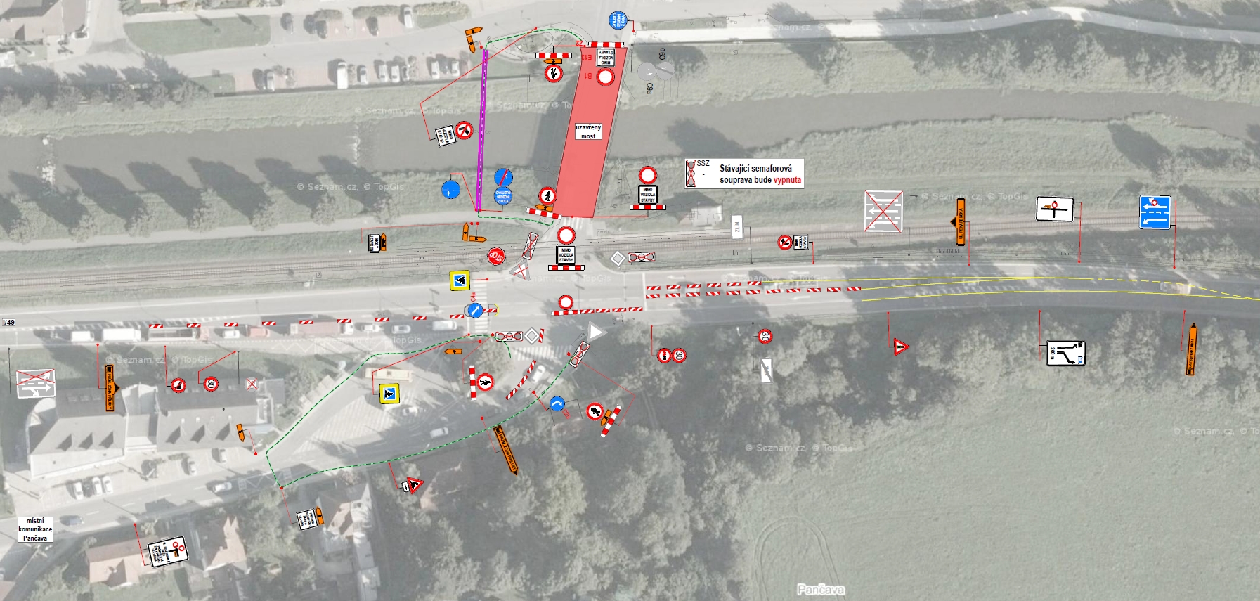 - Starý most u železniční tratě - bude uzavřen pro veškerý provoz, nebude možné na něj odbočit z žádného směru ani přes něj přejet.