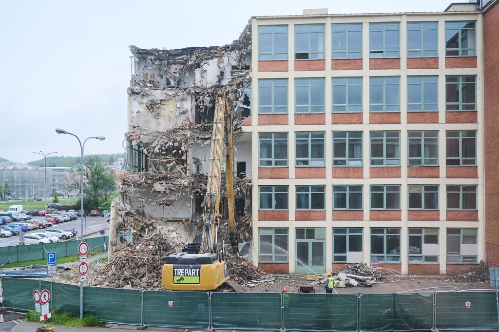 Demoliční stroje jsou vybaveny systémem vlastního skrápění, který snižuje prašnost. V oploceném areálu bude po celou dobu bourání fungovat také obsluha s proudnicí. „Výstavba nového objektu na stejném místě začne na jaře příštího roku,“ informoval kvestor UTB Alexander Černý s tím, že novostavba by měla vzniknout do září 2026.
