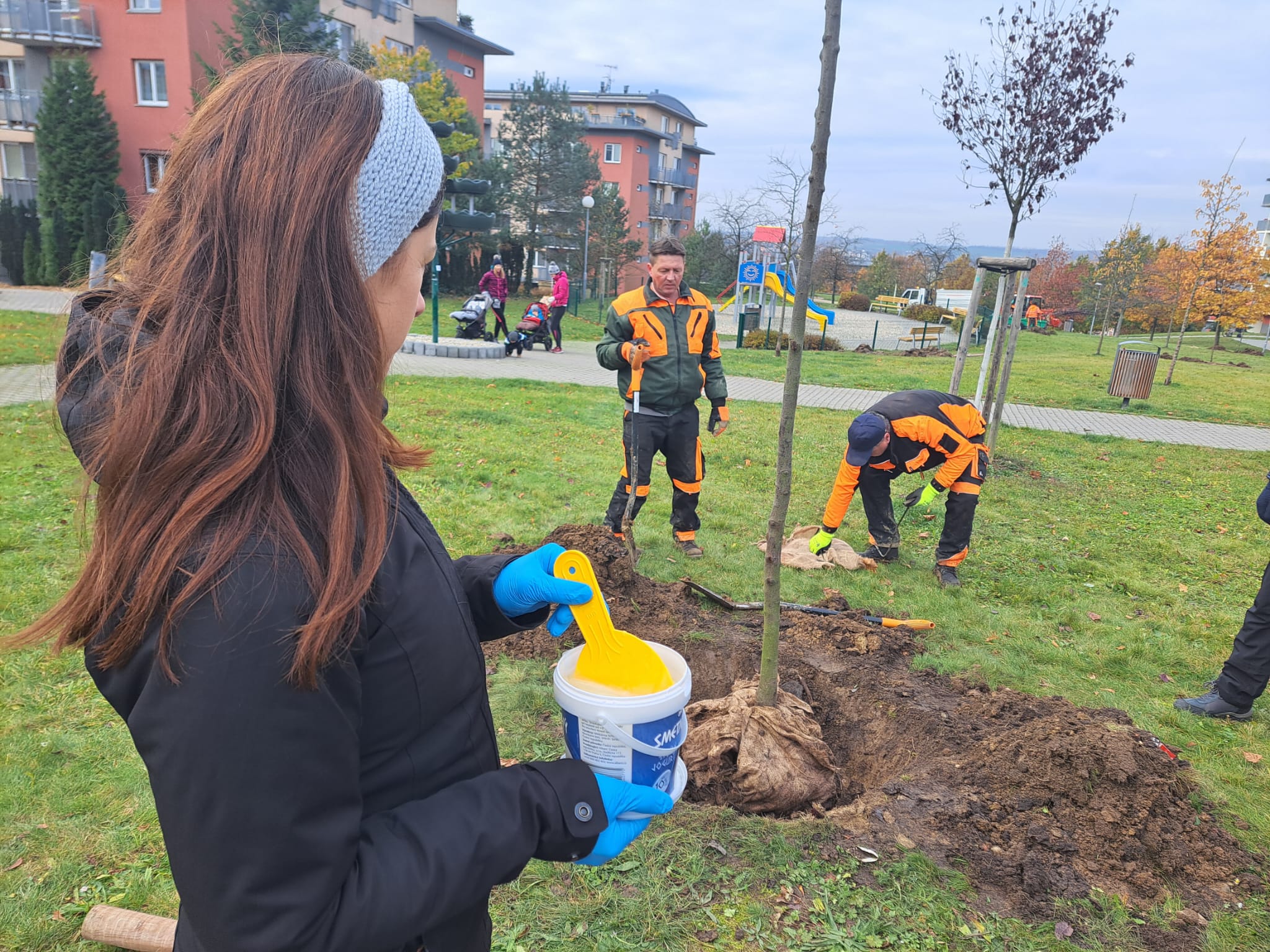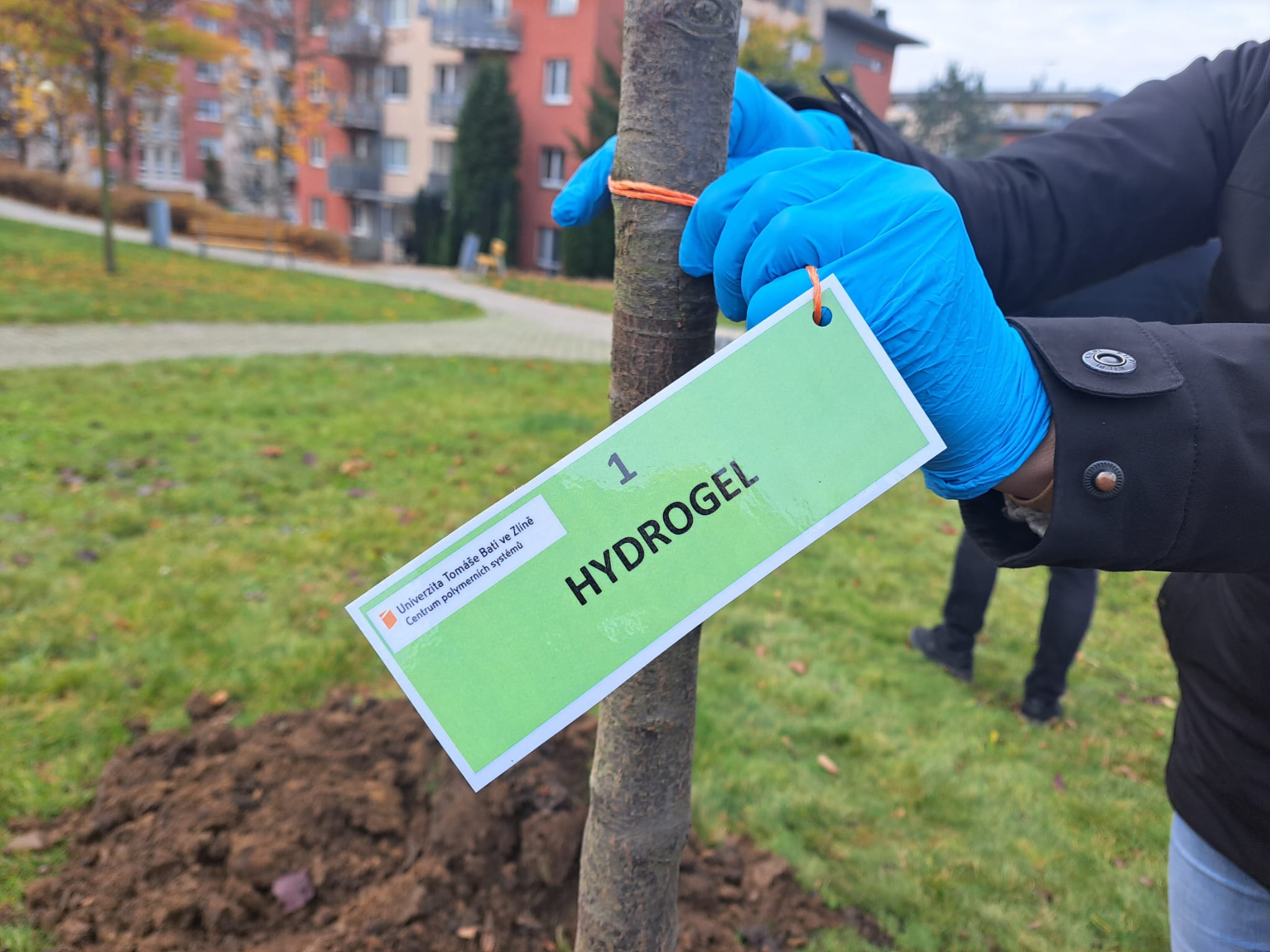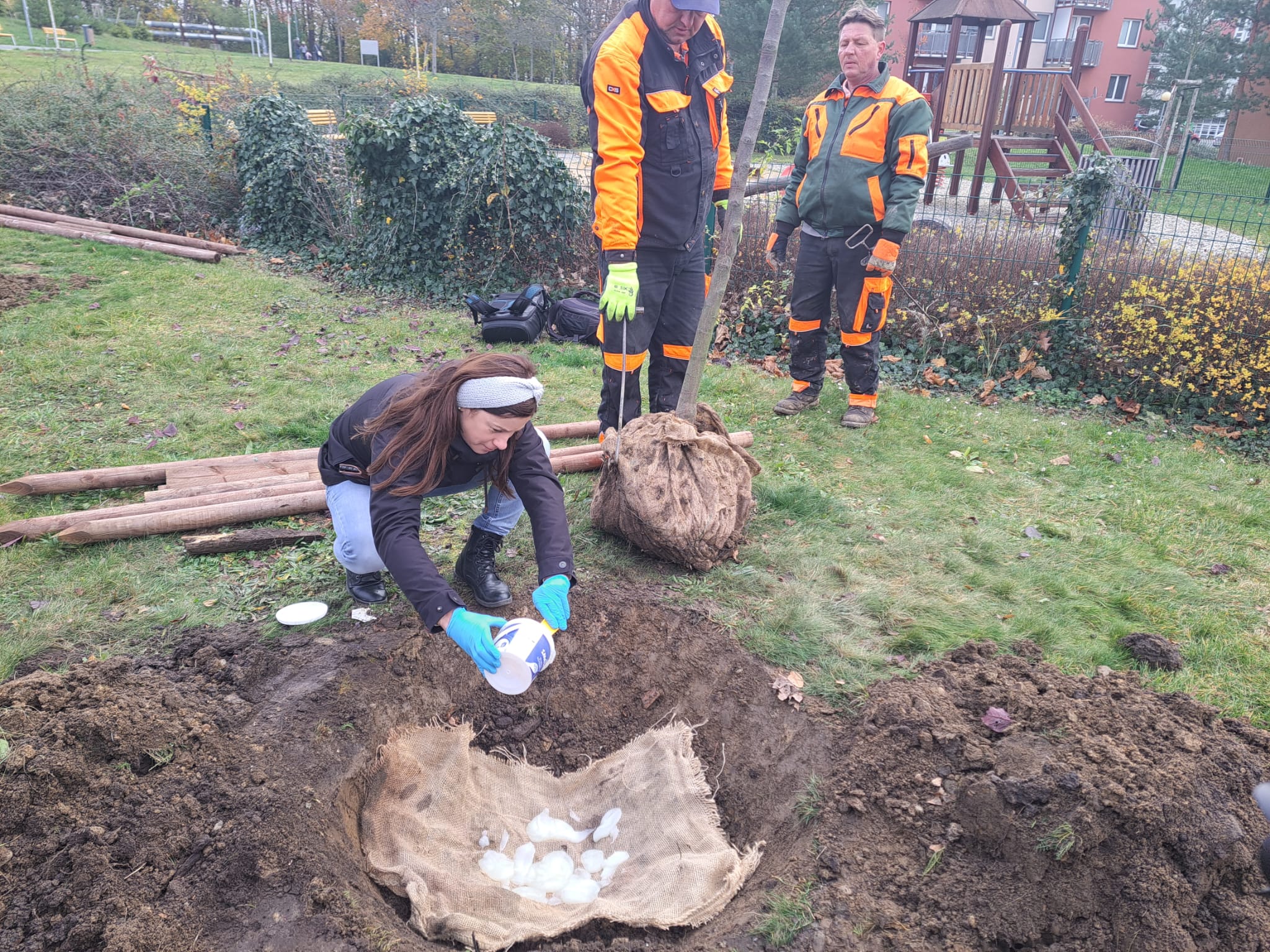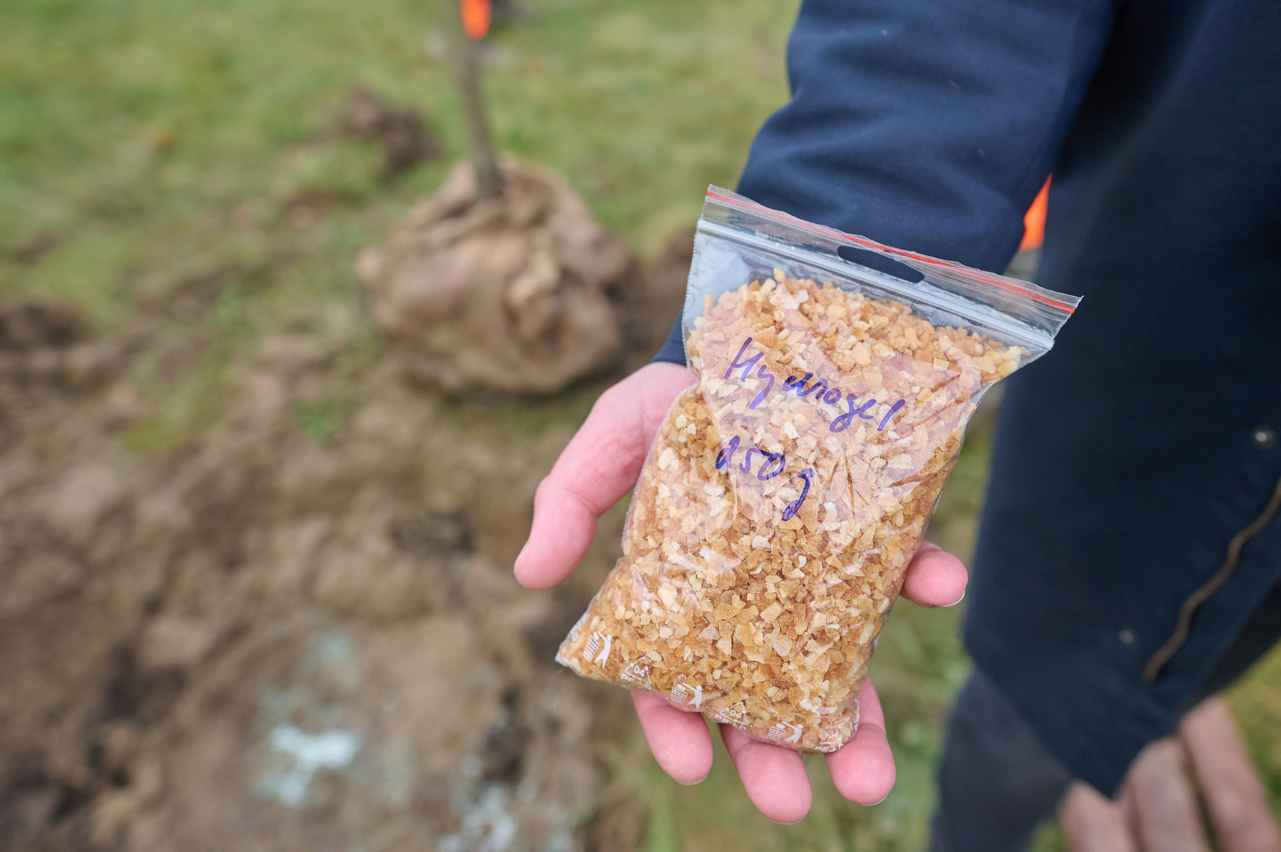 Biologicky rozložitelné hydrogely na bázi mléčné syrovátky přidali dnes zahradníci ke kořenovým systémům stromů v tekuté i sušené podobě. Některé nechali bez hydrogelů, aby měli později možnost porovnání.