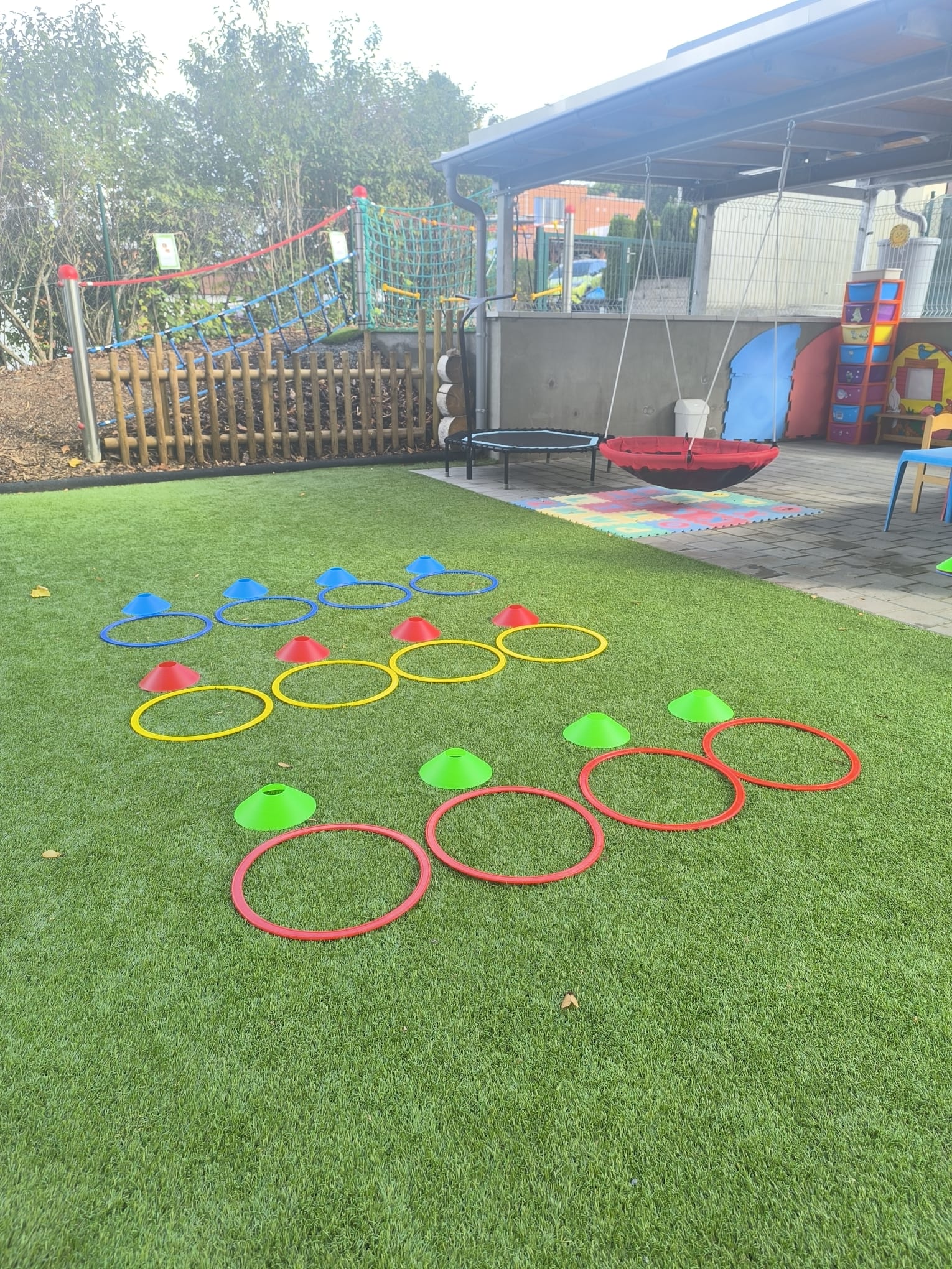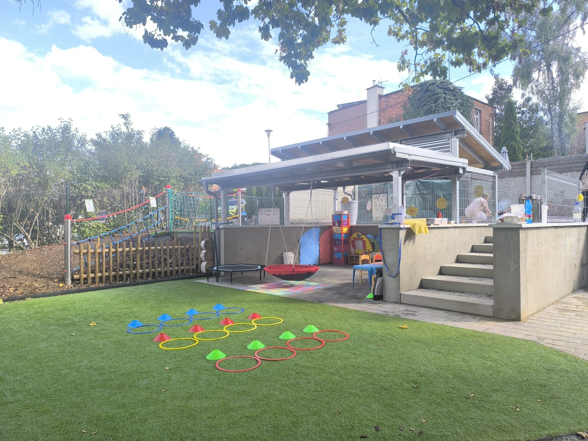 Horní a dolní zónu propojuje lanový park, nechybí ani kreslící nástěnné tabule a přístřešky s vegetačními střechami. Ty poskytují zázemí pro odkládání odrážedel, trampolíny, v jednom je umístěna houpačka typu „hnízdo“ a vestavěná dětská kuchyňka.