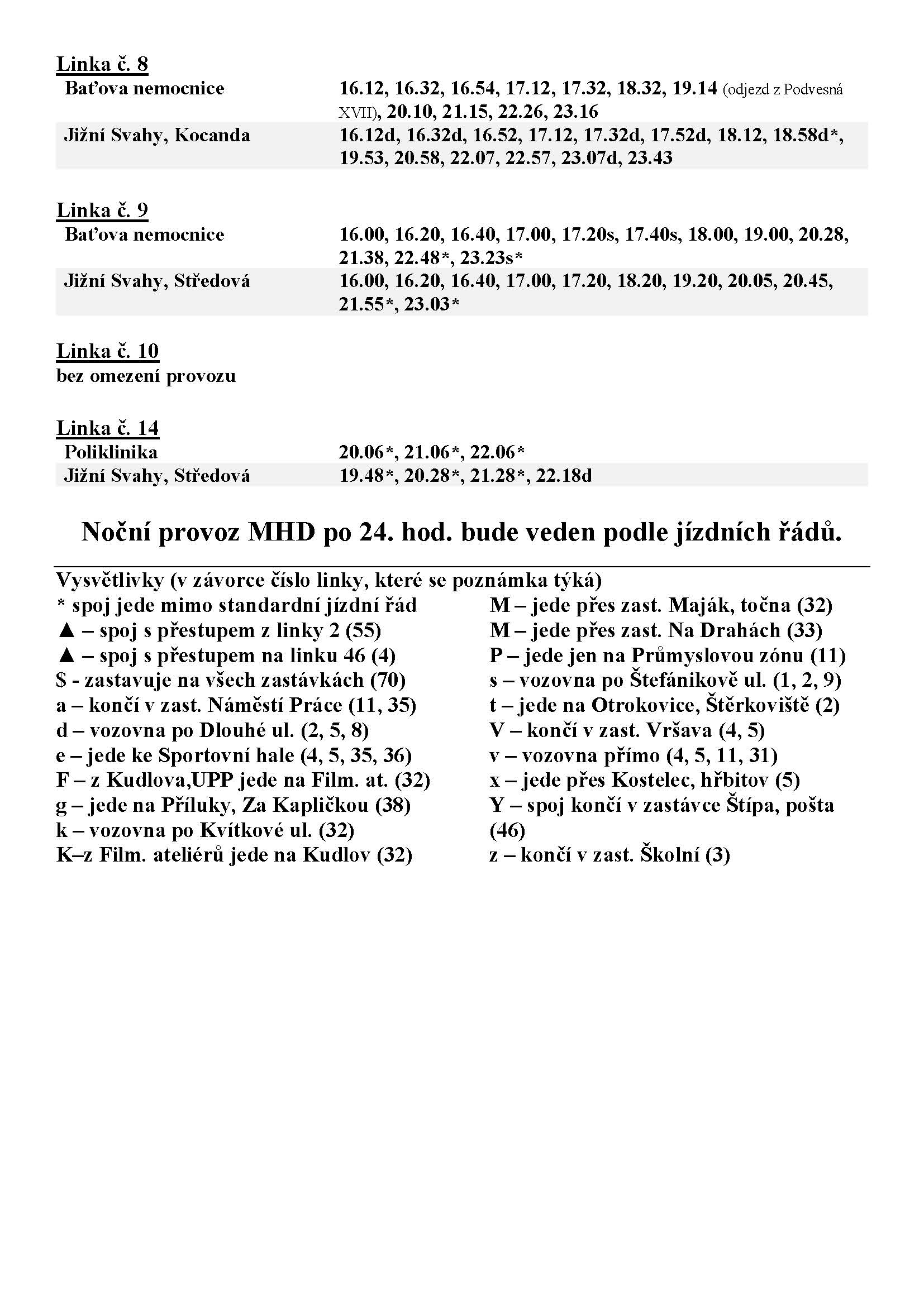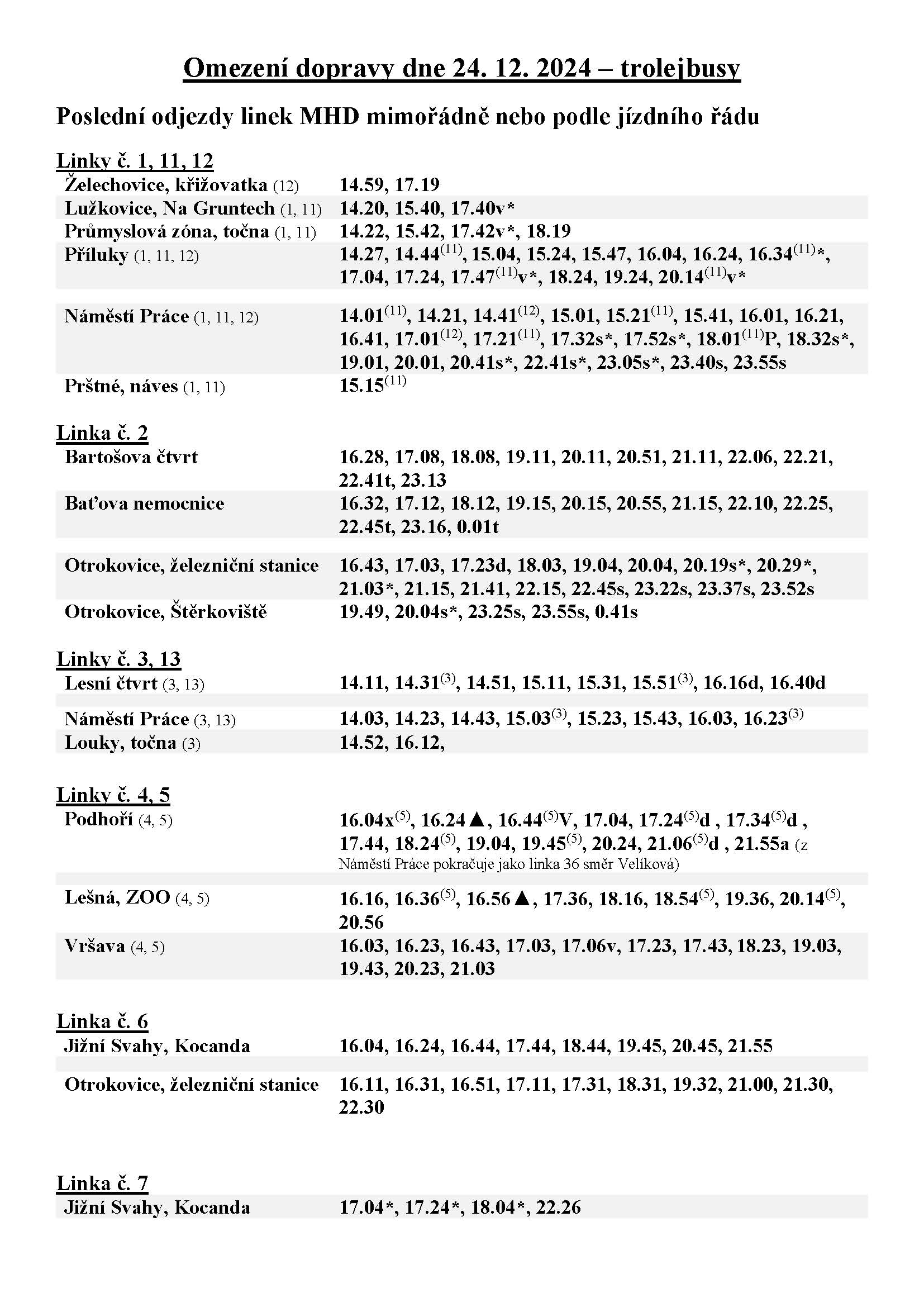 „Upozorňujeme cestující na prosincové odchylky jízdních řádů. Jednak dojde ke zkrácení pravidelného provozu MHD kromě nočních spojů večer 24. a 31. prosince, jednak budou mimořádně platit víkendové jízdní řády i v pracovních dnech 27. a 30. prosince, jednak budou ve dnech 23. prosince a 2. a 3. ledna platit jízdní řády pro školní prázdniny,“ uvedl Vojtěch Cekota, mluvčí Dopravní společnosti Zlín – Otrokovice. Dodal, že dispečink bude uživatelům MHD připomínat aktuálně platné odchylky také na elektronických informačních zastávkových panelech.