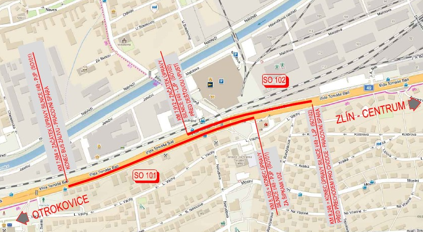 - v rámci dopravních opatření nebude také umožněno odbočení z místní komunikace ul. K. Světlé doleva na sil. I/49 tř. Tomáše Bati směr Otrokovice a ze sil. I/49 tř. Tomáše Bati směr od centra Zlína doleva na místní komunikaci ul. K. Světlé (bude proto zřízena a vyznačena objízdná trasa po místních komunikacích ul. K. Světlé, ul. Svat. Čecha, ul. Hřbitovní, ul. Pod Šternberkem a ul. Šternberská).