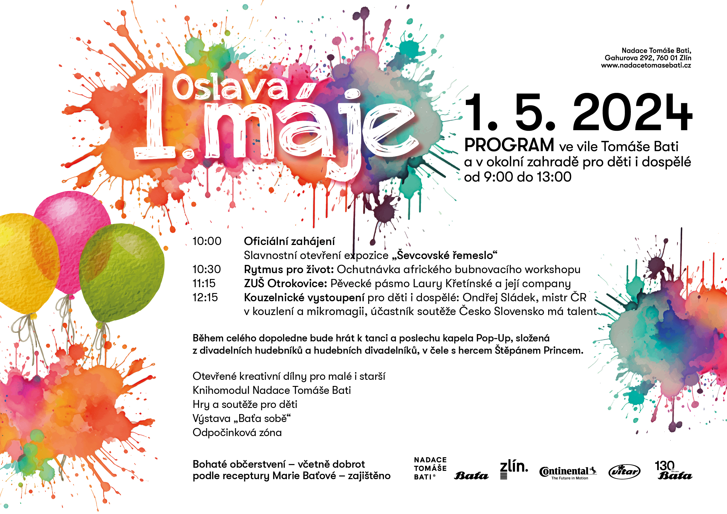 - letos uplyne už sto let od okamžiku, kdy přišel Tomáš Baťa s nápadem, že si firma Baťa uspořádá vlastní prvomájovou oslavu, která poté každoročně přilákala do Zlína tisíce návštěvníků. Na tuto tradici v devadesátých letech navázala Nadace Tomáše Bati. I letos zve děti i dospělé na prvomájovou oslavu, která se ponese v duchu hudby, kultury a zábavy pro všechny věkové kategorie. Bohatému programu budou tentokrát vévodit otevřené kreativní dílny přímo v zahradě vily. „Přijďte si umíchat baťovský čaj, vyrobit originální dekorace z kůže, nebo navrhnout vlastní desing trička,“ zvou organizátoři z nadace.
