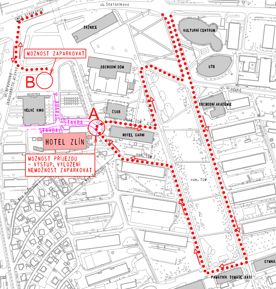 „Po dohodě se zástupci Obchodního domu a Hotelu Zlín jsme našli řešení, které při splnění požadavků policie vyhovuje všem účastníkům a zároveň navazuje i na chystanou rekonstrukci Velkého kina,“ uvedl náměstek primátora pro dopravu Michal Čížek. A doplnil, že se na východní straně Velkého kina, konkrétně v místě nyní nevyužívaného chodníku, rozšíří odstavné plochy pro kolmé parkování vozidel. „Plocha je navržena ze zatravňovací dlažby. Dočasnost tohoto objektu je dána výhledovou rekonstrukcí Velkého kina. I zde bude řešena rekonstrukce stávající komunikace,“ vysvětlil Čížek.