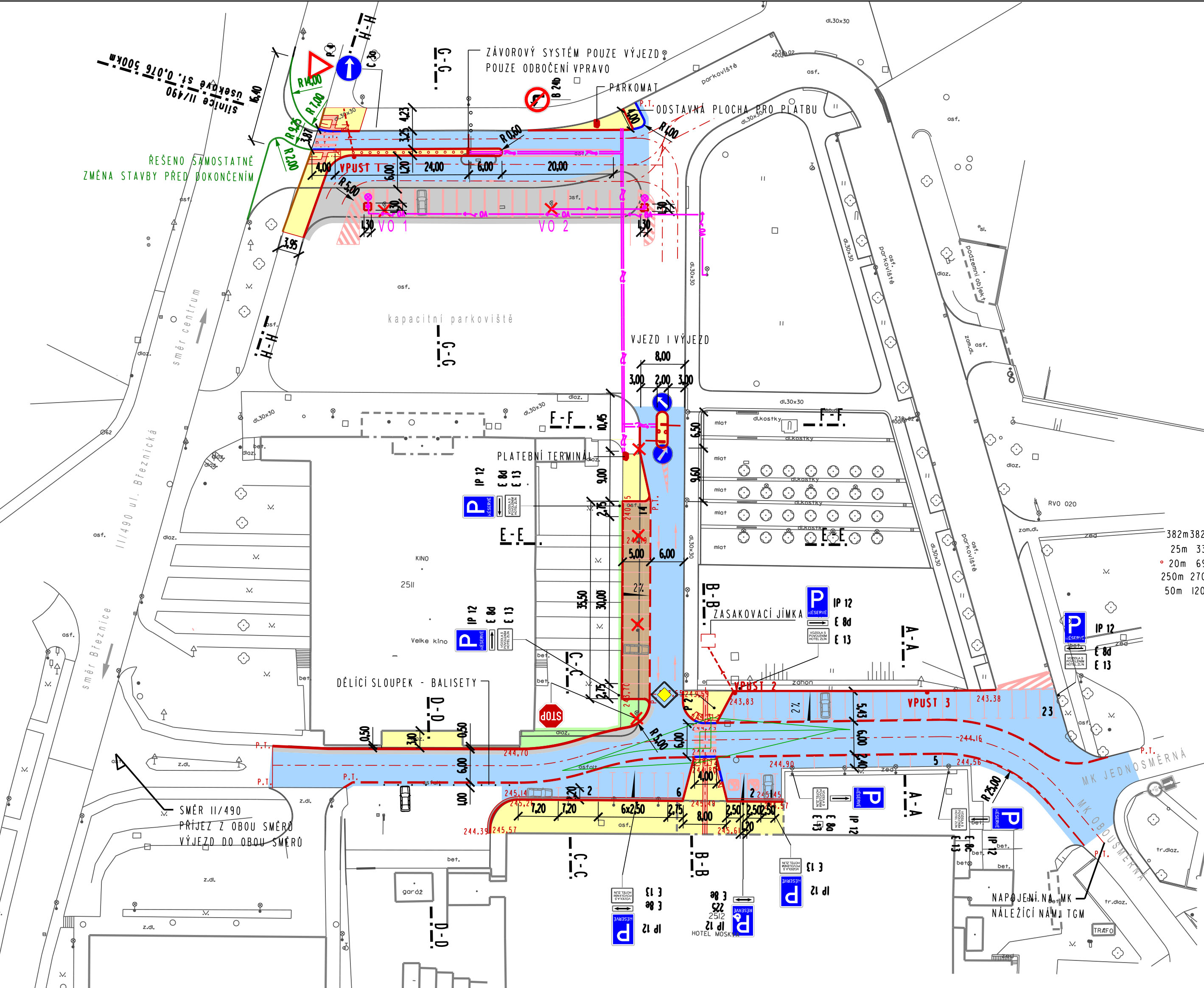Nový vjezd a výjezd na parkoviště Velkého kina vznikne v dočasně zaslepeném prostoru, a to podél východní strany Velkého kina.
