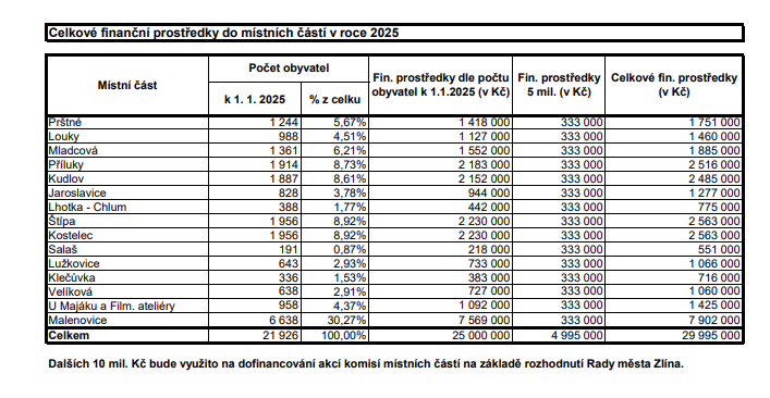Město kromě každoročně přidělovaných financí ve výši 25 milionů korun vyčleňuje z rozpočtu, stejně jako loni, navíc 15 milionů korun. „Pět milionů korun bude rozděleno mezi patnáct příměstských částí paušálně, každé části se přidělí rovný díl, tedy 333 tisíc korun. Částka deset milionů pak bude využita na dofinancování investičních akcí komisí místních částí na základě rozhodnutí Rady města Zlína,“ vysvětlila náměstkyně Jana Bazelová.