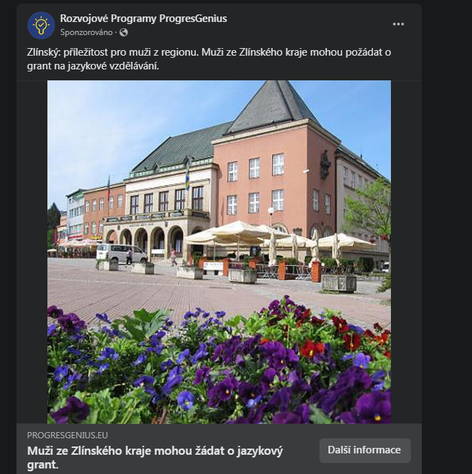 Sponzorovaný příspěvek nápadně připomíná ten, který se na sociální síti objevil loni v květnu. Zatímco tehdy společnost VaR programy lákala na jazykové kurzy a slibovala finanční podporu ženám, Rozvojové Programy ProgresGenius nyní cílí na muže z celého Zlínského kraje. Prostřednictvím internetové stránky Progresgenius.eu mohou žádat o jazykový grant. Žadatel musí po otevření stránky vyplnit formulář, konkrétně uvést jméno, telefonní číslo, e-mailovou adresu a následně vyčkat na telefonát.