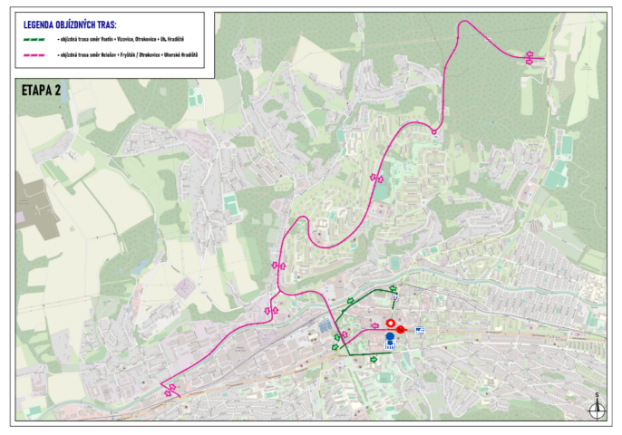 Objízdná trasa ve směru z Fryštáku na Otrokovice povede po silnicích III/49018 a III/49016, dále po ulicích Nábřeží a Přímá (Jižní Svahy a Prštné). Totožná objízdná trasa bude vyznačena také v opačném směru, tedy ve směru z Otrokovic na Fryšták.