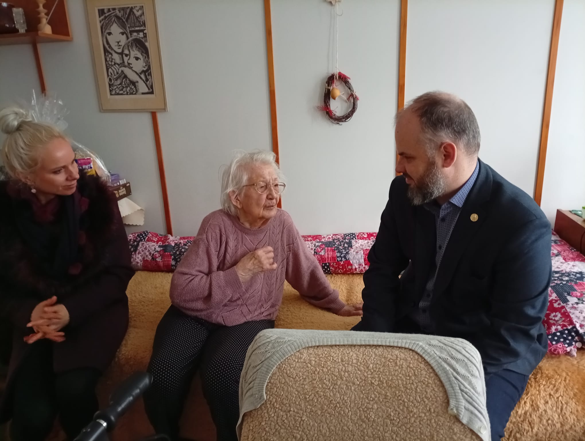 O den později přivítala energická žena s úsměvem na tváři také gratulanty z radnice, kteří jí předali květiny spolu s dárkovým košem vybraných potravin.