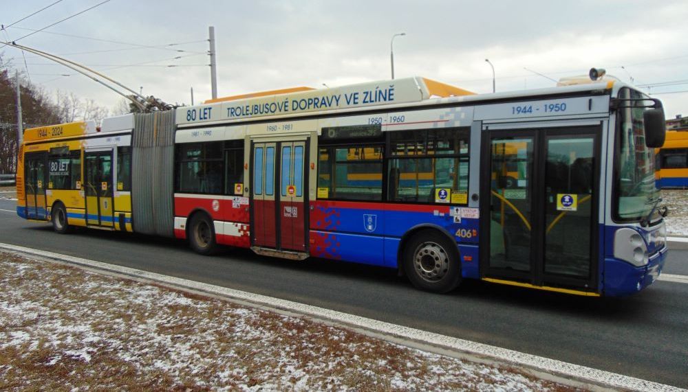 Nízkopodlažní kloubový trolejbus Škoda 25 Tr Irisbus s dieselagregátem, ev. č. 406, bude svou celoplošnou reklamou po celý rok připomínat obyvatelům a návštěvníkům Zlína i Otrokovic, že uplynulo kulatých 80 let od zavedení trolejbusové dopravy ve Zlíně. Provoz trolejbusů s prvními třemi vozy na prvních linkách A, B, C byl slavnostně zahájen 27. ledna 1944. DSZO se k tomuto výročí ve svých tiskových dokumentech v příštích dnech ještě vrátí.
