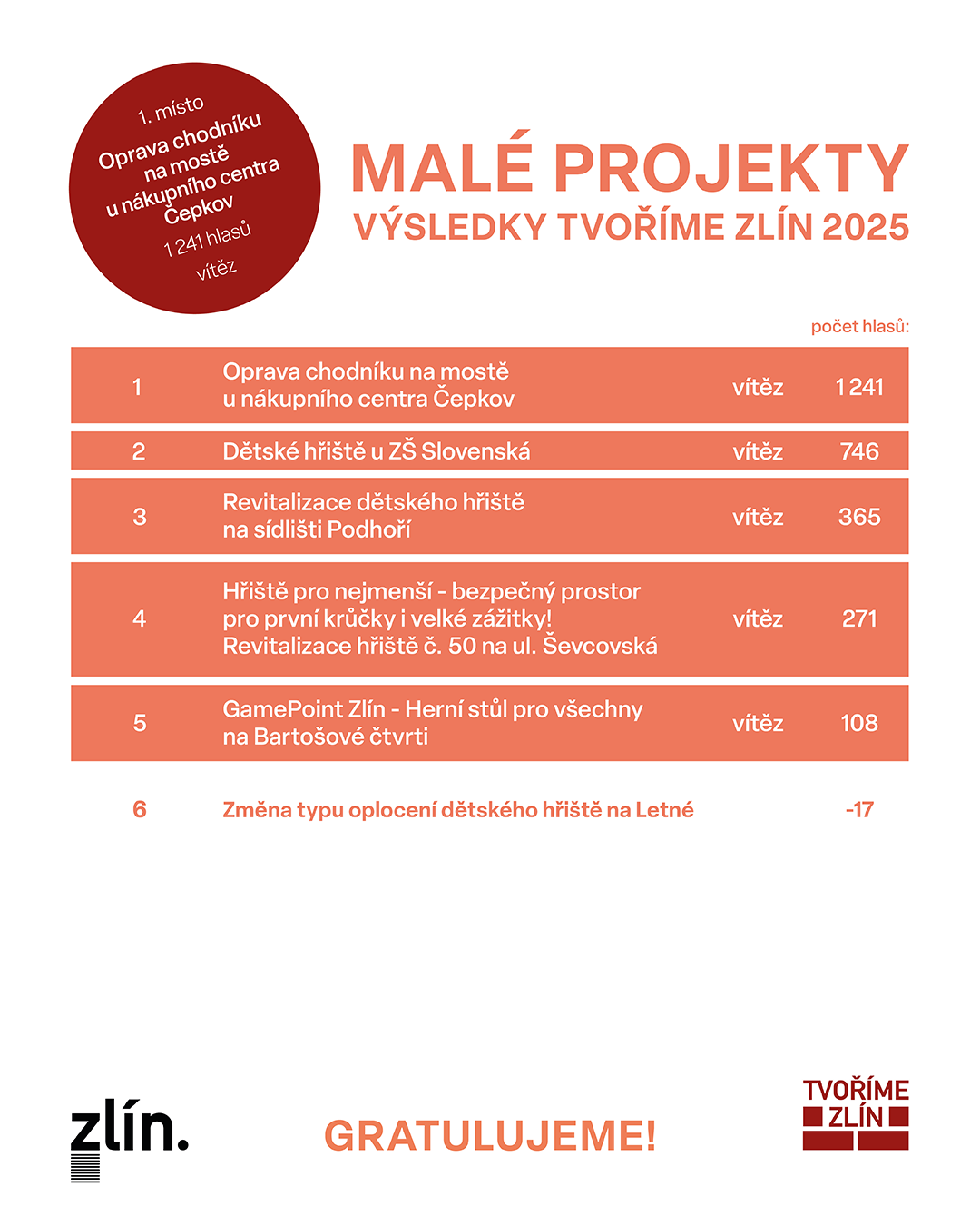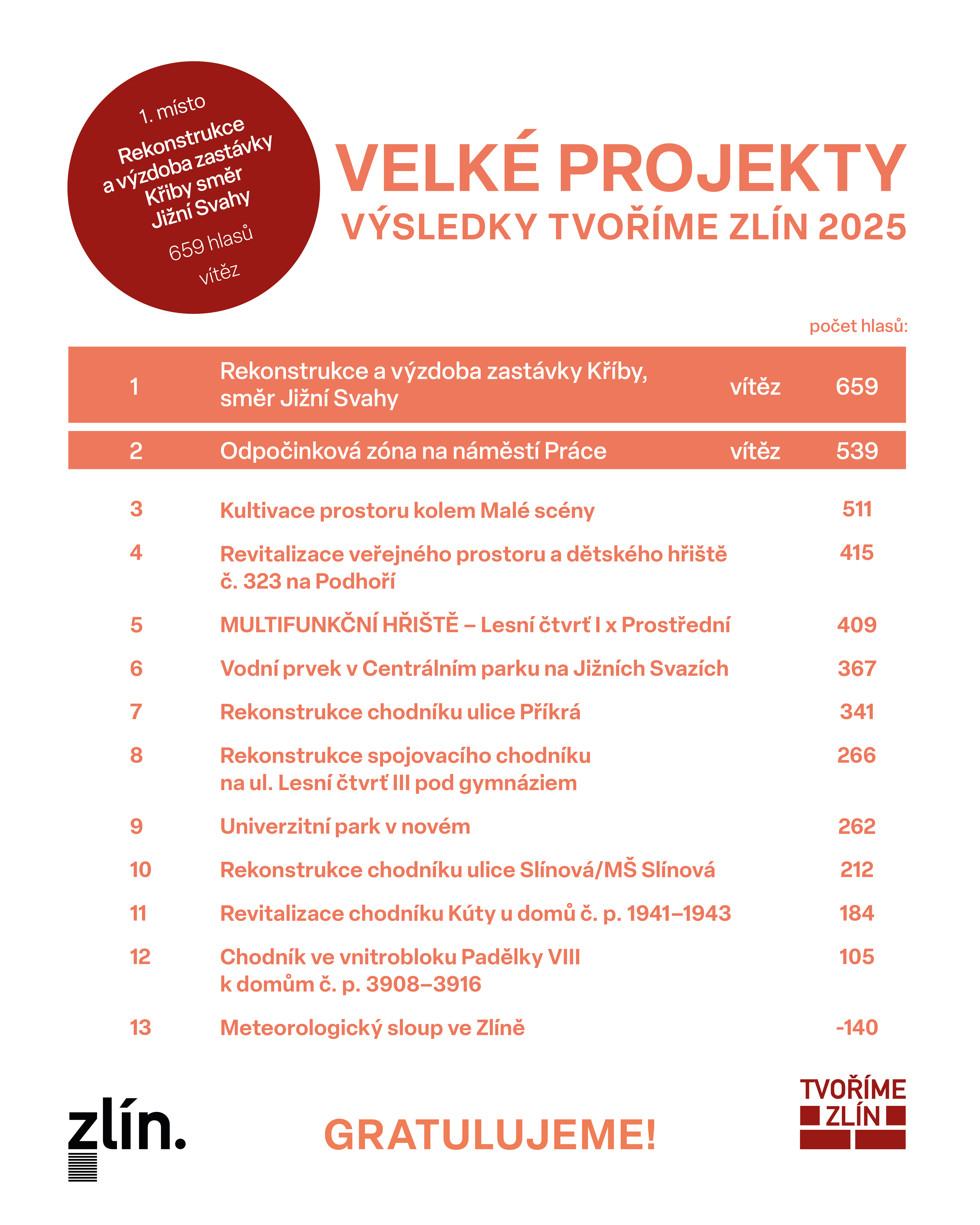 „Tvoříme Zlín každoročně ukazuje, jak silný zájem mají lidé o podobu svého města. Vítězné návrhy jsou důkazem toho, že i relativně malé zásahy dokážou výrazně zlepšit veřejný prostor a přinést radost široké veřejnosti. Všem, kteří se zapojili, patří velké poděkování,“ uvedla náměstkyně primátora Jana Bazelová, která má projekt na starosti.