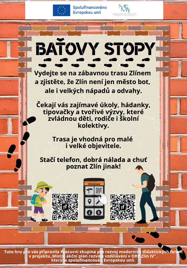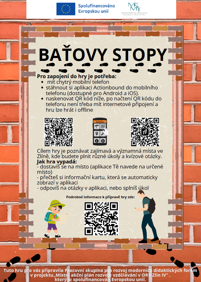 Letní novinku – interaktivní hru Baťovy stopy připravila Pracovní skupina pro rozvoj moderních didaktických forem v projektu Místní akční plán rozvoje vzdělávání v ORP Zlín IV, který je spolufinancován Evropskou unií.