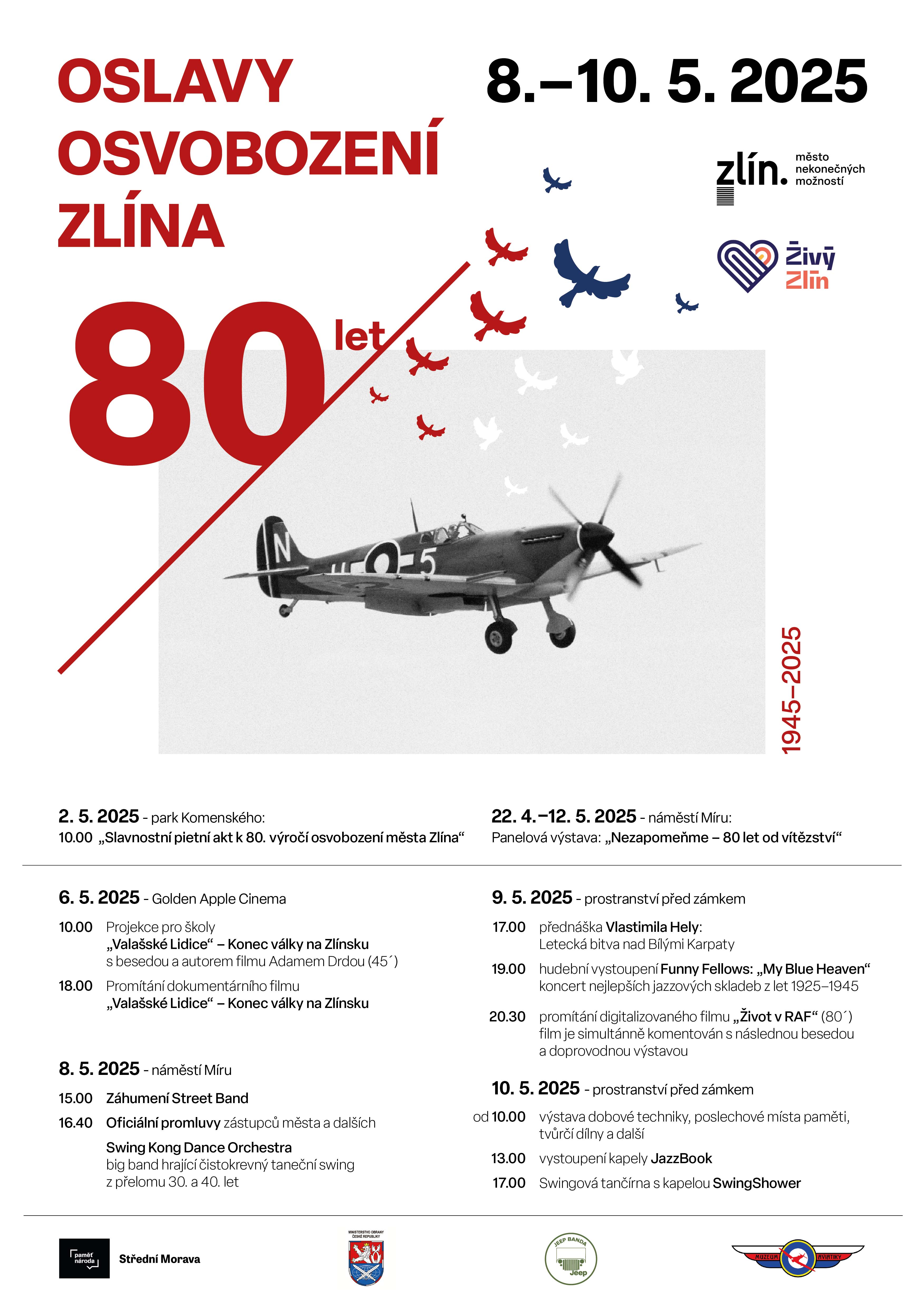 V pátek 9. května zvou organizátoři na zámek a do Sadu Svobody. V 17 hodin se v sále zámku uskuteční přednáška Vlastimila Hely o letecké bitvě nad Bílými Karpaty. „Výběr nejlepších jazzových skladeb z let 1925 – 1945 pak venku zahraje kapela Funny Fellows. Promítneme také digitalizovaný film Život v RAF, který doplní beseda a výstava,“ upřesnila Jana Kubáčová.