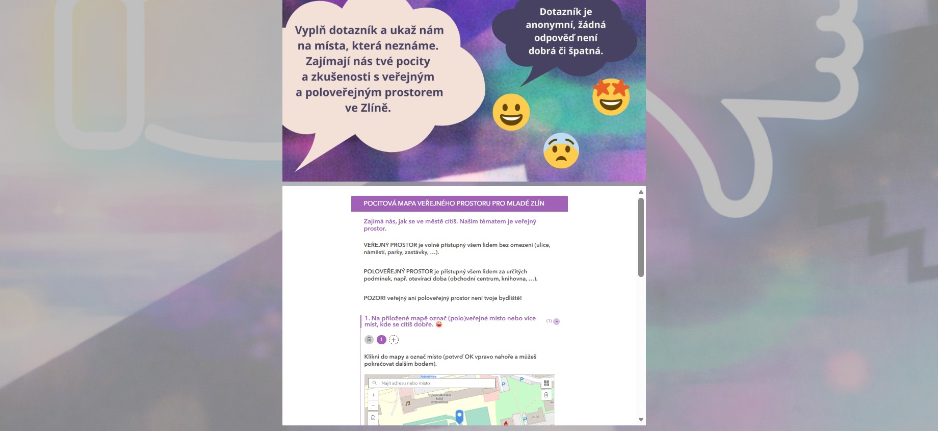 Pocitová mapa představuje jednoduchý a anonymní nástroj, který umožňuje mladým lidem vyjádřit vlastní názor i osobní zkušenost s prostředím, v němž se pohybují. Zároveň podporuje jejich občanskou angažovanost a posiluje vztah k místu, kde žijí.