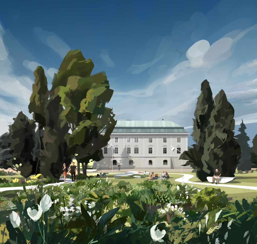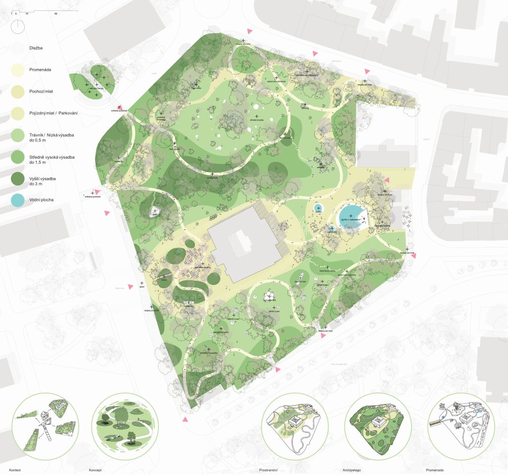 Vítězný návrh zachovává atmosféru krajinářského parku a dále ji rozvíjí. Odkazuje k instalovaným zrcadlům a pracuje s motivem ostrovů a souostroví zeleně, mezi kterými lze procházet po nově navržených trasách doplněných o drobné umělecké intervence. Zároveň návrh zachovává možnost průchodu parkem hlavními dosavadními směry.