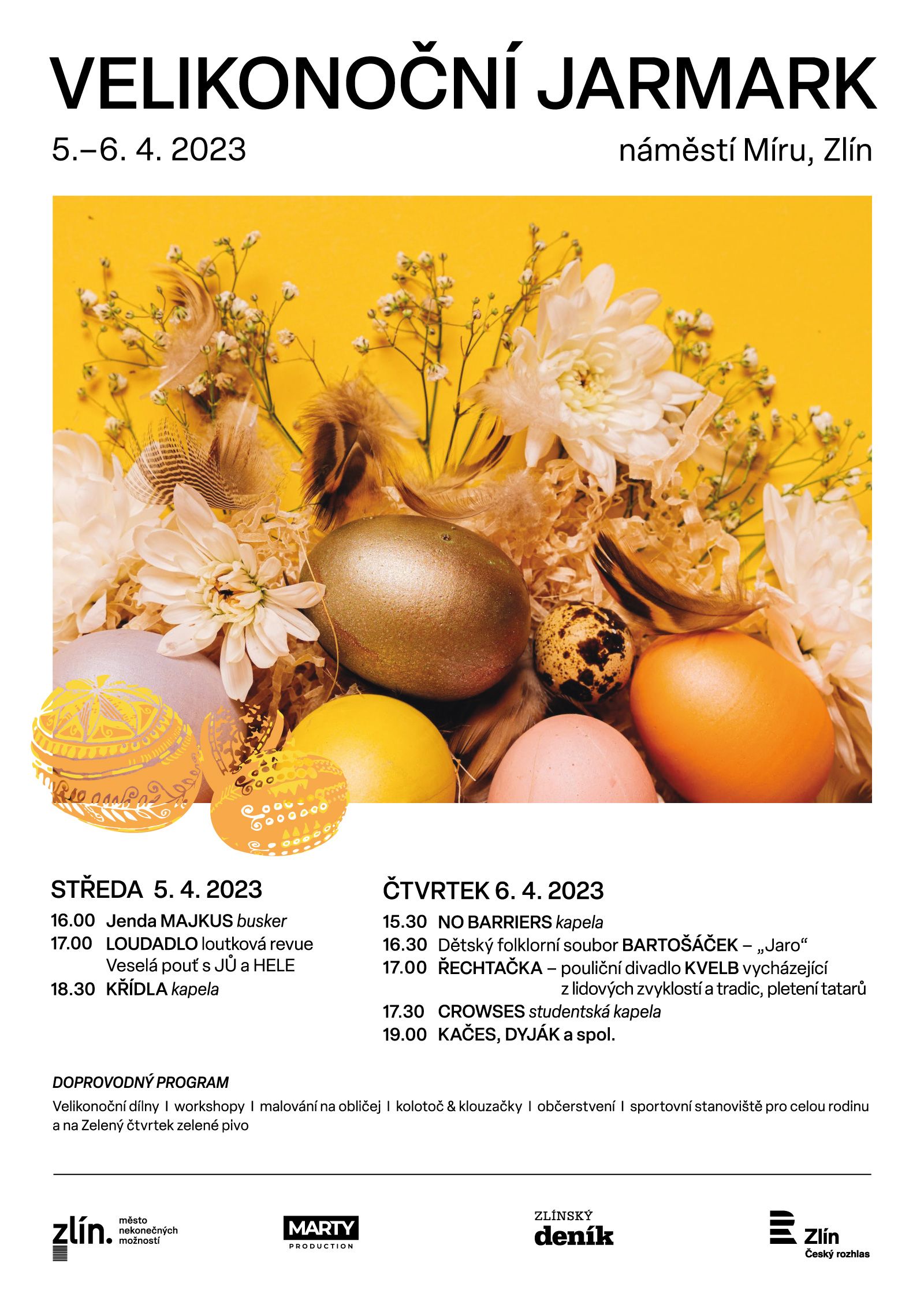 Tradiční velikonoční trh pořádá město od 5. do 6. dubna 2023 na náměstí Míru ve Zlíně. Prodej ve stáncích začíná po oba dny v 8 hodin a končí v 18 hodin.