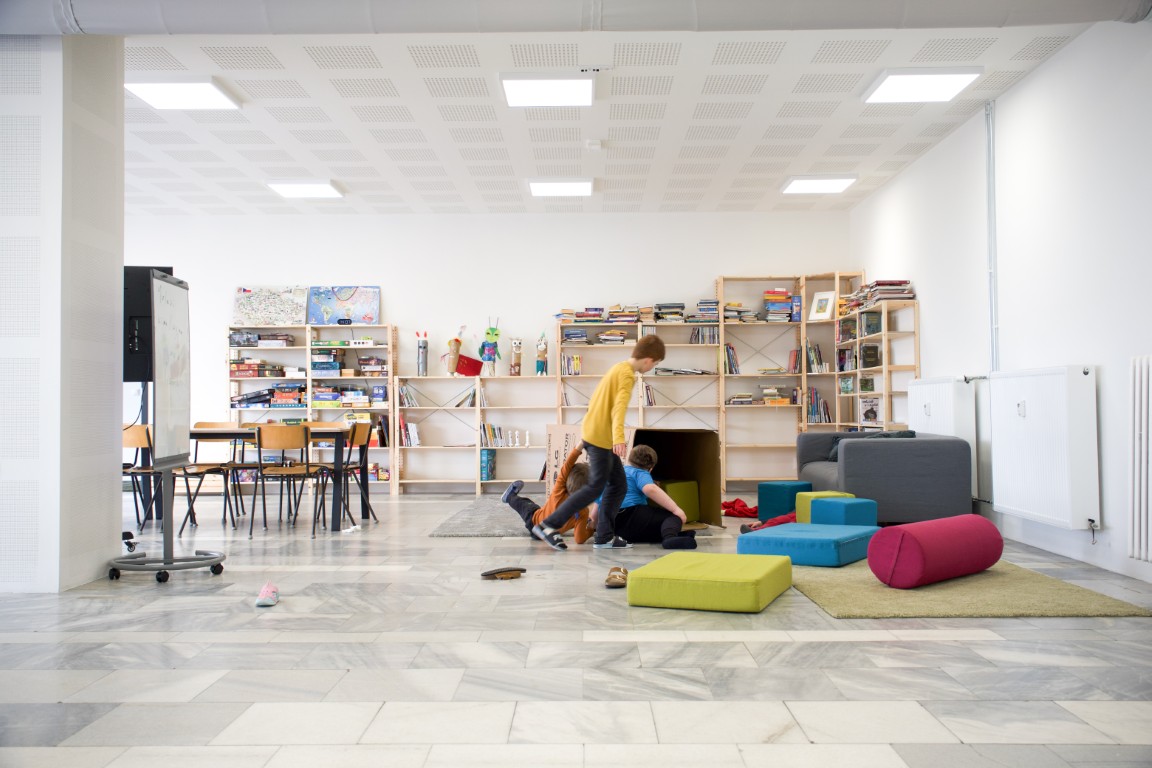 Ve škole nejsou žádné klasické třídy, ale otevřený prostor bez bariér, ve kterém nabízí vlastní bistro, navíc tady mohou rodiče využívat pracovní zónu. Dominantou školního prostředí je variabilní prostor, který díky prosklené výloze propojuje život školy s děním na ulici. Vnitřní členění umožňuje vše, cokoliv průvodce neboli učitele napadne: od výuky přes hraní divadla až po trénink u boxovacího pytle.