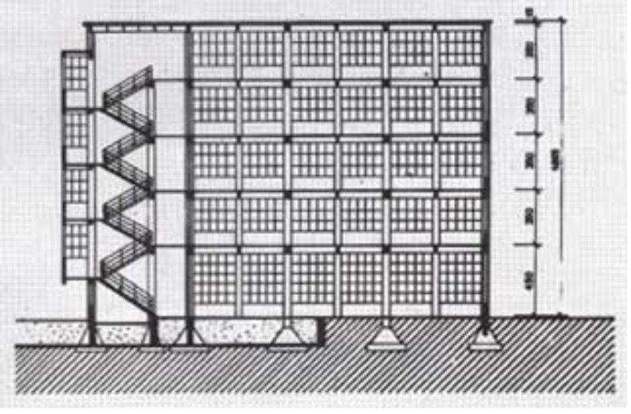 Zlomový rok pro stavební činnost firmy Baťa byl rok 1927, kdy byl vyvinut jednotný systém železobetonového skeletu nejprve s čtvercovými, od roku 1930 s kruhovými sloupy a s modulovým rozpětím 6,15 m x 6,15 m, realizovaný pomocí posuvného bednění. Počet podlaží půdorysných rozměrů 3 x 13 polí se pohyboval od dvou do pěti. Obvodové cihelné neomítané zdivo s velkými členěnými okny a s přiznaným nosným konstrukčním systémem se stalo průvodním znakem jednotné zlínské architektury. Koncepce užívaného standardu uvolnila obvodové stěny a umožnila tak dokonalé prosvětlení celé pracovní plochy. Tímto systémem koncepce objektu se dospělo k uvolnění vzájemné závislosti mezi stavební a technologickou částí objektu, tedy respektování principů univerzality, opakovatelnosti, variability a flexibility stavební a technologické části. Typizované průmyslové objekty byly řazeny šachovnicově do větších výrobních souborů a vzájemně propojeny dopravním zařízením. Jejich racionální "výroba" vedla k relativně nízkým investičním nákladům. Výstavba pětipodlažního objektu o rozměrech 80 x 20 m trvala od výkopu po kolaudaci 5 měsíců! Takto byly postaveny všechny nejdůležitější budovy v továrně včetně vrcholného díla architekta Karfíka, zlínského funkcionalismu i československé meziválečné architektury, správní budovy firmy Baťa.