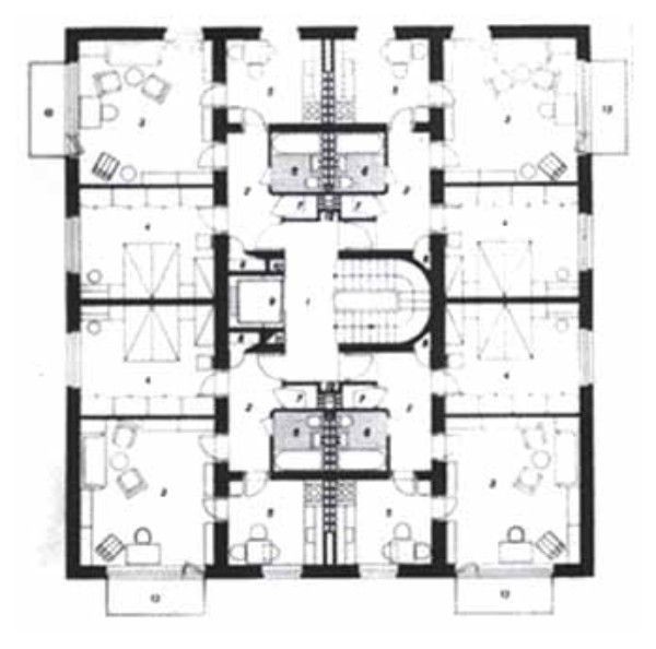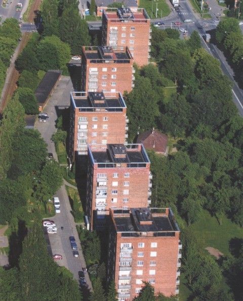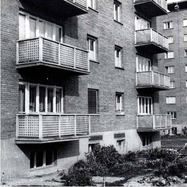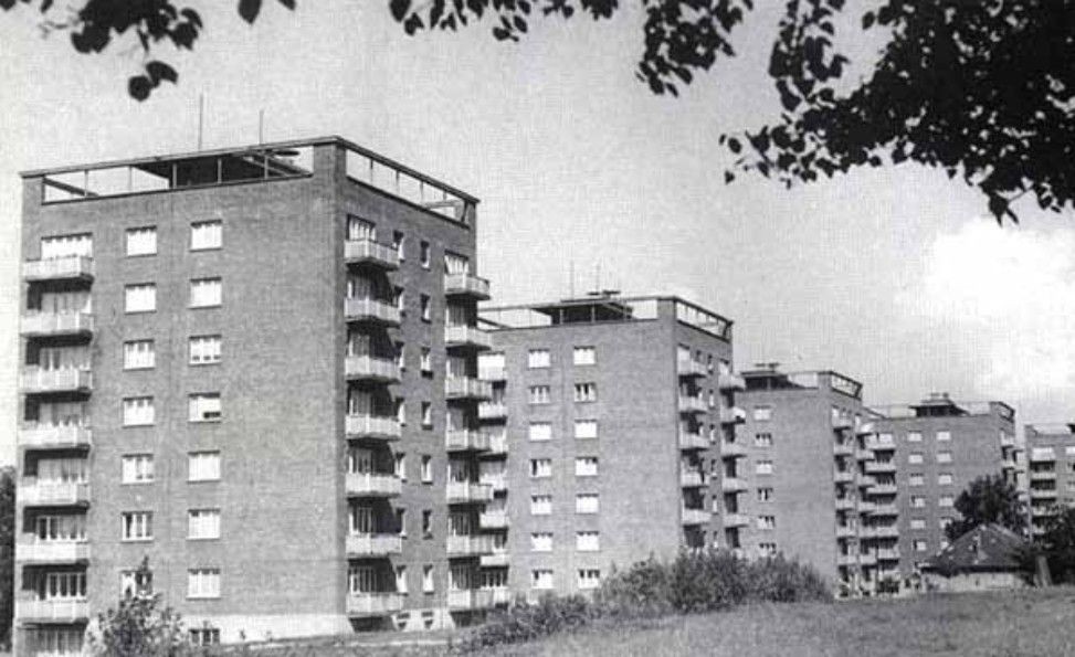 V roce 1947 se začalo stavět 5 osmietážových věžových domů, každý o 29 dvoupokojových bytech s obytnou plochou 45 m2. Jsou dílem architekta Miroslava Drofy, který nalezl inspiraci v obdobných stavbách ve Skandinávii. Dispozice používá vnitřního, přímo neosvětleného schodiště. Také jednotlivé byty mají příslušenství uvnitř dispozice, které je s vestavěnou kuchyňskou linkou uměle odvětráváno. Poprvé zde bylo použito nosné cihelné konstrukce na výšku osmi podlaží. Stropy jsou monolitické železobetonové. Fasáda je obohacena betonovými prefabrikovanými balkóny. Skupina je příkladem konstruktivistického pojetí víceetážových obytných budov a tvoří součást údolního panorámatu a hlavní městské třídy.