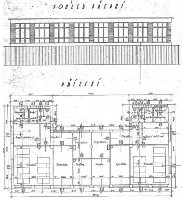 Pavilony byly vystavěny na půdorysu mělkého písmene "U" otevřeného směrem k severu. V severním průčelí byl situován vchod dvoukřídlými dveřmi. Z hlavní chodby byly přístupny jednotlivé pokoje pacientů orientované k jihu - vždy dva (rohové) se sedmi lůžky a čtyři se dvěma lůžky. V čelech chodby se pak nacházely inspekční pokoj a denní místnost. Záchody s předsíňkou, lázeň, pracovna sestry (či obvazovna nebo čekárna apod.) byly situovány k severu.
