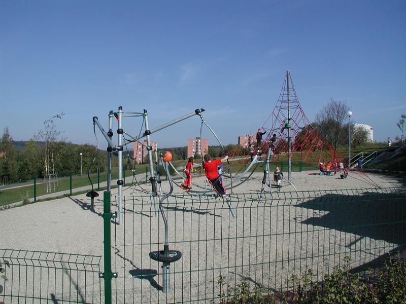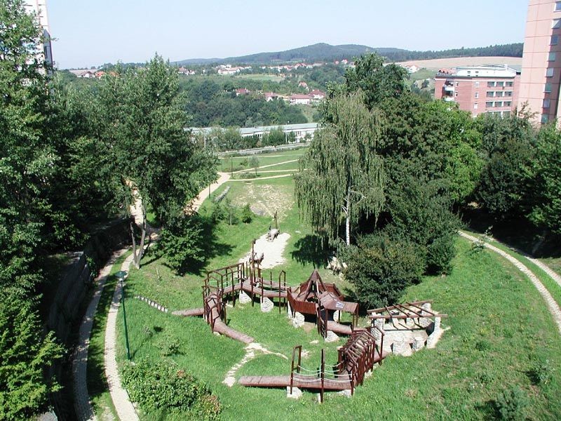 Na plochy u žlebu na západním okraji parku je situován soubor 7 sportovišť s univerzálními plochami pro míčové hry a cvičnou tenisovou stěnou. Je zde také plánován obslužný objekt, zapuštěný pod úroveň terénu.