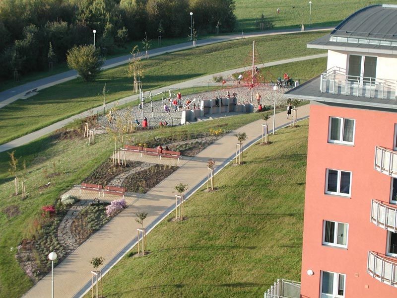 K ulici České se park svažuje tzv. Kozlovým žlebem, kde se nachází stávající porosty přírodního charakteru a na ně jsou navázány nové výsadby dřevin.
