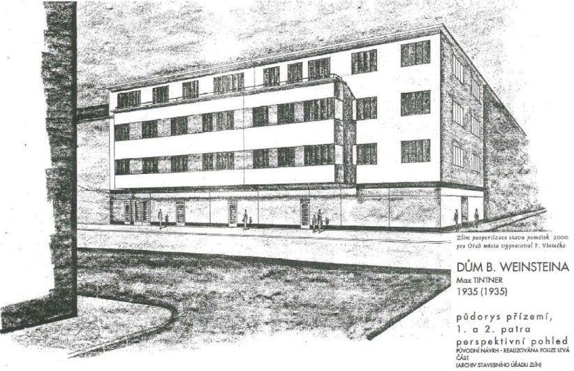 Objekt byl postaven jako obchodní a obytný dům p. Weinsteina, obchodníka a majitele módního závodu, v místě proluky v ulici Rašínově vedle tehdejšího domu manželů Weinsteinových, kteří tvořil nároží ulice Rašínovy a náměstí Míru. Původně projekt počítal s výstavbou domu na obou částech pozemku (proluka - bývalé zbořeniště a tehdejší nárožní dům) - tím bylo vytvořeno nové nároží do náměstí Míru.