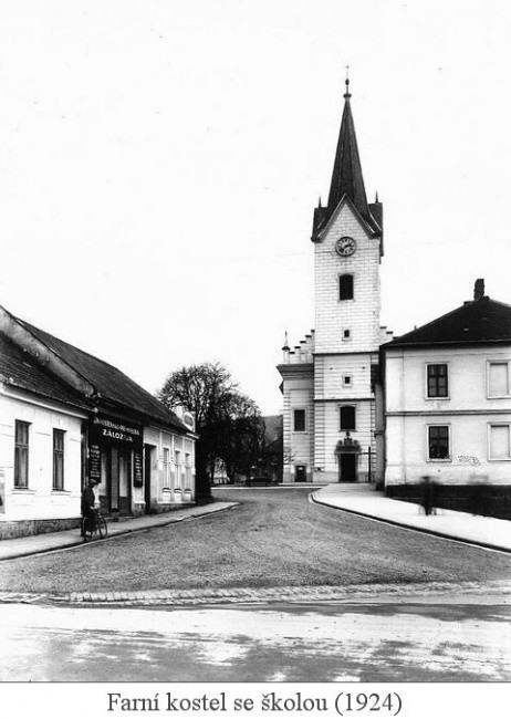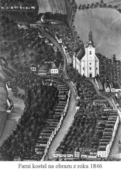 Kostel stojí na místě středověké stavby, jeho nejstarší částí je pravděpodobně zdivo věže (P. A. Červinka zmiňuje zvýšení věže již v r. 1566). Starší kostel byl orientován ve východo-západním směru a věž stála mimo něj. Při přestavbě počátkem 19. století byla postavena nová větší loď tak, aby se věž dostala do čela stavby. Na tuto přestavbu věnoval peníze baron Klaudius Bretton a jeho žena Cecilie Magnisová, které připomíná erb nad vchodem. Dochovaná úprava fasád je zřejmě o něco mladší (snad z poloviny 19. stol.), malířská výzdoba stropu je z počátku 20. stol. (vídeňský malíř Schmidt), liturgická úprava a radikální zásahy do interiéru jsou z r. 1969-70 (F. Peňáz, mozaiky vytvořil A. Klouda). Pozoruhodná je křížová cesta od Karla Stádníka.