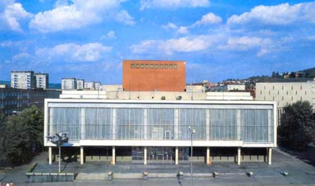 V roce 1957 byla vypsána anonymní soutěž a v roce 1958 byl vybrán návrh architektů Miroslava a Karla Řepových na projekt činoherního divadla. Po dlouhých letech usilování, plánování, potíží a obav, zda se podaří dílo uskutečnit, dostalo město 11. 11. 1967 divadelní budovu. Jedná se o soubor dvou volně stojících objektů (hlavní a provozní)spojených dvěma komunikačními krčky, umístěných v centru města na přibližně trojúhelníkovém pozemku, doplněných uličním parterem se sochařskými díly a zadním parkem s kašnou. Hlavní budova je příkladem reprezentativní, bohatě materiálově i umělecky vybavené architektury s některými rysy Bruselského stylu. Sálu dominuje lomenicový dřevěný podhled. Střízlivá noblesa interiérů, kontrastuje s monumentálním vnějším výrazem hlavní budovy, obložené několika druhy kamene. Hlavní průčelí je v patře celé proskleno, tím vytváří světelně proměnlivé pozadí soše vznášející se můzy. Dynamicky působí provozní budova s křivkou spojovacího krčku a zvlněnou siluetou. I přes své nesporné kvality znamenala stavba divadla tvrdý zásah do městské struktury, mimo jiné spojený s demolicí fary.