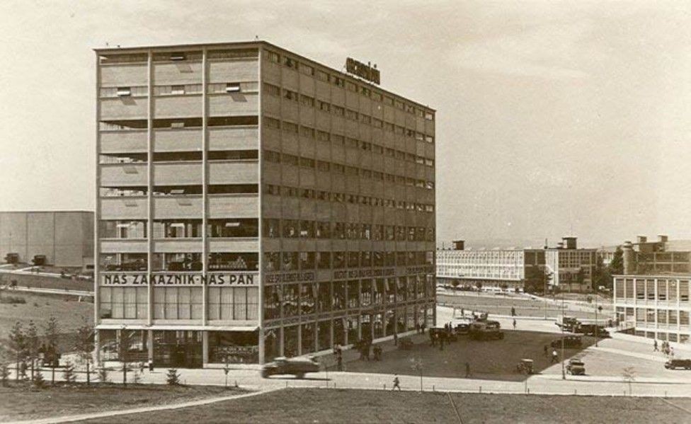 Obchodní dům služeb ve Zlíně byl jednou z prvních staveb na nově se formujícím náměstí Práce, při jeho umístění architekt respektoval nejen dráhu železniční vlečky směřující z továrny do cihelny, ale také konfiguraci terénu. Dispozice Obchodního domu ovlivnila i projekt skupiny internátů nad ním. Zadní technické zázemí doplnil v r. 1934 Vladimír Karfík. Zajímavá byla gradace zmenšující se výškou pásových oken směrem nahoru. Tento architektonicky mimořádně účinný prvek opticky odhmotňující stavbu se s časem měnil v návaznosti na způsob využívání horních podlaží byly postupně jejich parapety snižovány. Důležitým výtvarným prvkem dotvářejícím fasádu byly i četné reklamní nápisy. Celková architektonická koncepce budovy byla znehodnocena úpravami ze 70. let, kdy obklady z hliníkového plechu a nová okna zcela degradovaly výraz stavby (zrušení gradace, změna materiálu). Dnešní podoba dvorního traktu je z r. 1961.