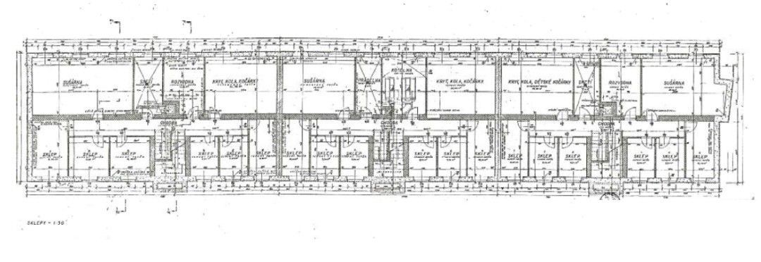 V každém patře byl ze schodišťového prostoru přístupný shoz na odpadky ukončený v suterénu spalovací pecí (z hygienických důvodů zrušeno); v suterénu jsou též situovány větrané zděné sklepní kóje pro každý byt a společné prostory kočárkárny, prádelny a sušárny.